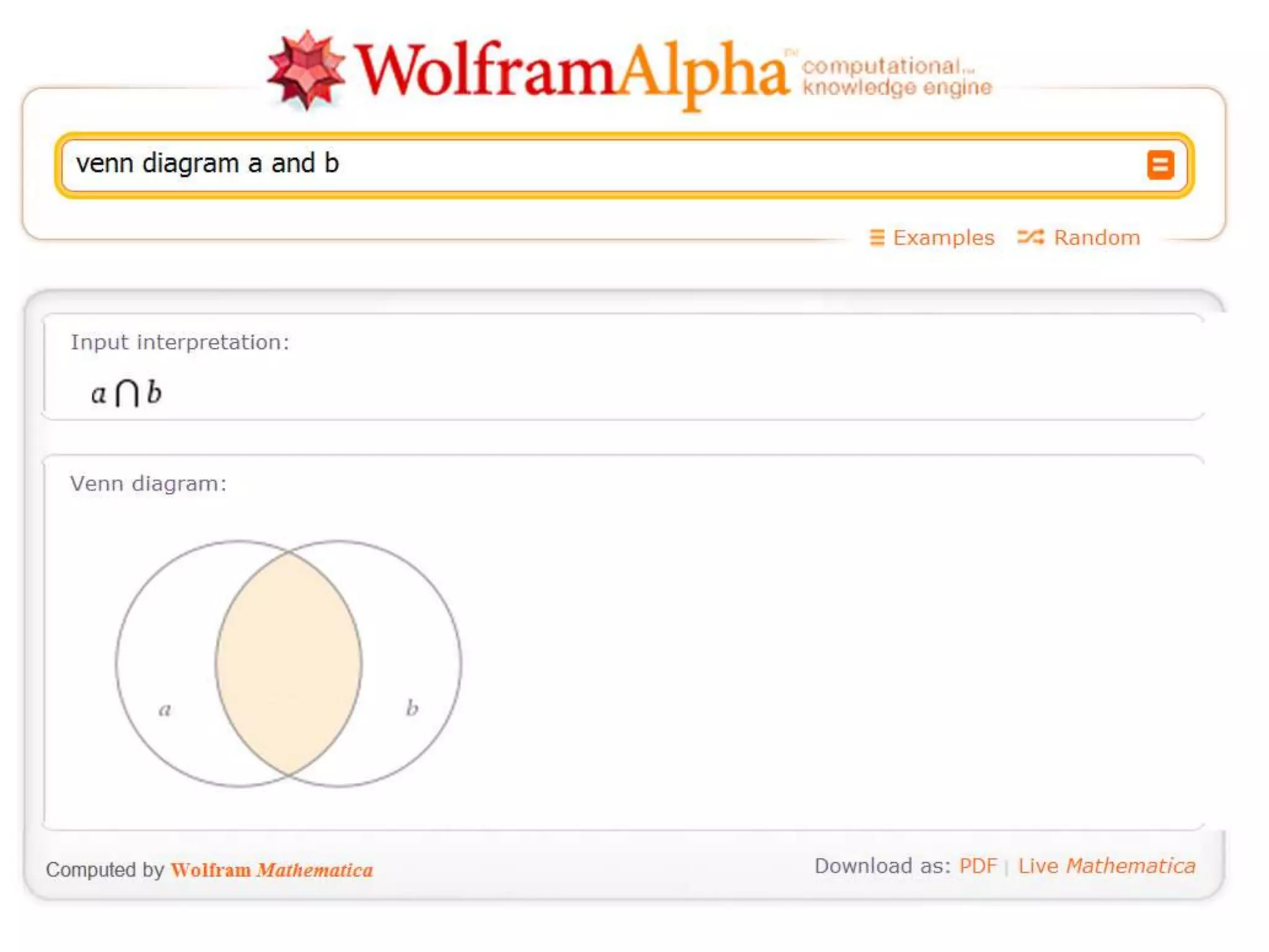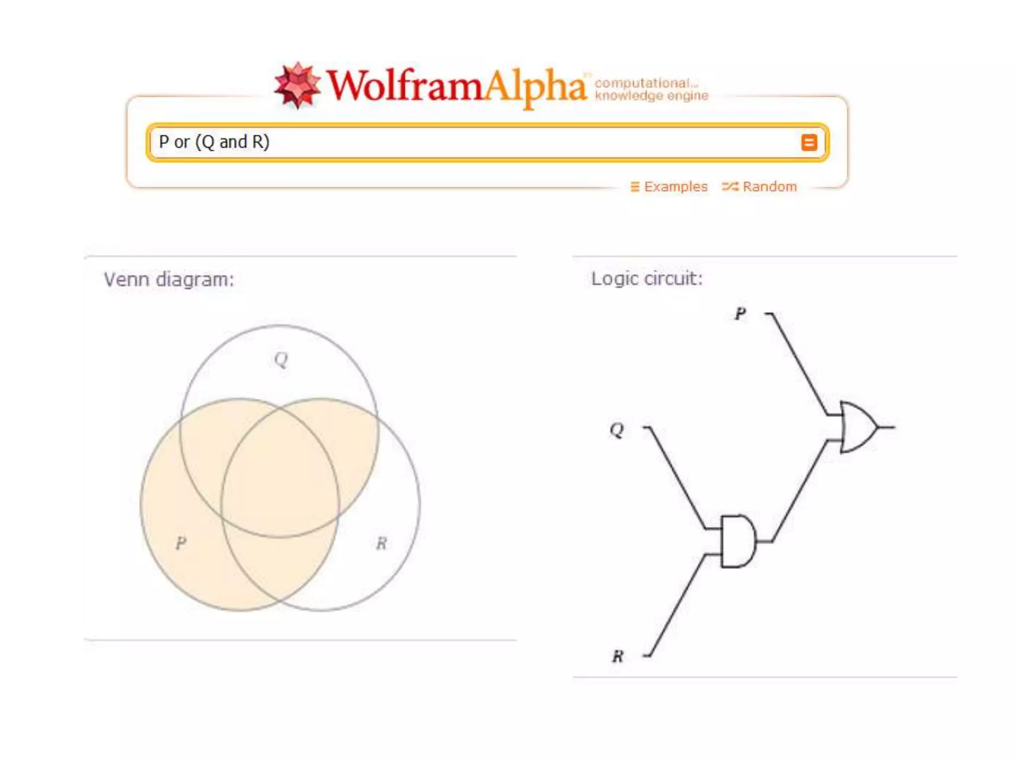 This document provides examples of how to use WolframAlpha to check work and explore examples in set theory and logic. It notes that entering "venn diagram" returns set theory and logic examples, while logical expressions like "p intersection q" and "p and q" return different results. The document encourages using logical functions like "and", "or", and "not" to get information from WolframAlpha like Venn diagrams, logic circuits, and more.