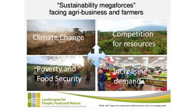 Businesses are increasingly at risk of “sustainability megaforces” – interconnected risks that will have unprecedented effects on business performance and profitability in the futureThese mega-forces include: climate change; competition for energy, land, water and material resources; population growth and migration; poverty and food insecurity; and ecosystem degradation. Food and beverage businesses will be directly and indirectly affected by a range of global trajectoriesKPMG, 2012. Expect the Unexpected: Building business value in a changing world.-------------------Based on our research findings, agribusinesses find water, climate, and community risks to be urgent, and best suited to piloting landscape approaches. Agribusinesses and food sector brand manufacturers are increasingly aware of sustainability risks. The interconnectedness of the water-food-energy-climate nexus is increasingly being recognized by business as requiring integrated solutions. In some cases, stability in key sourcing and operational regions may be at stake. World Economic Forum, 2011. Water Security: The Water-Food-Energy-Climate Nexus. Island Press.---------------