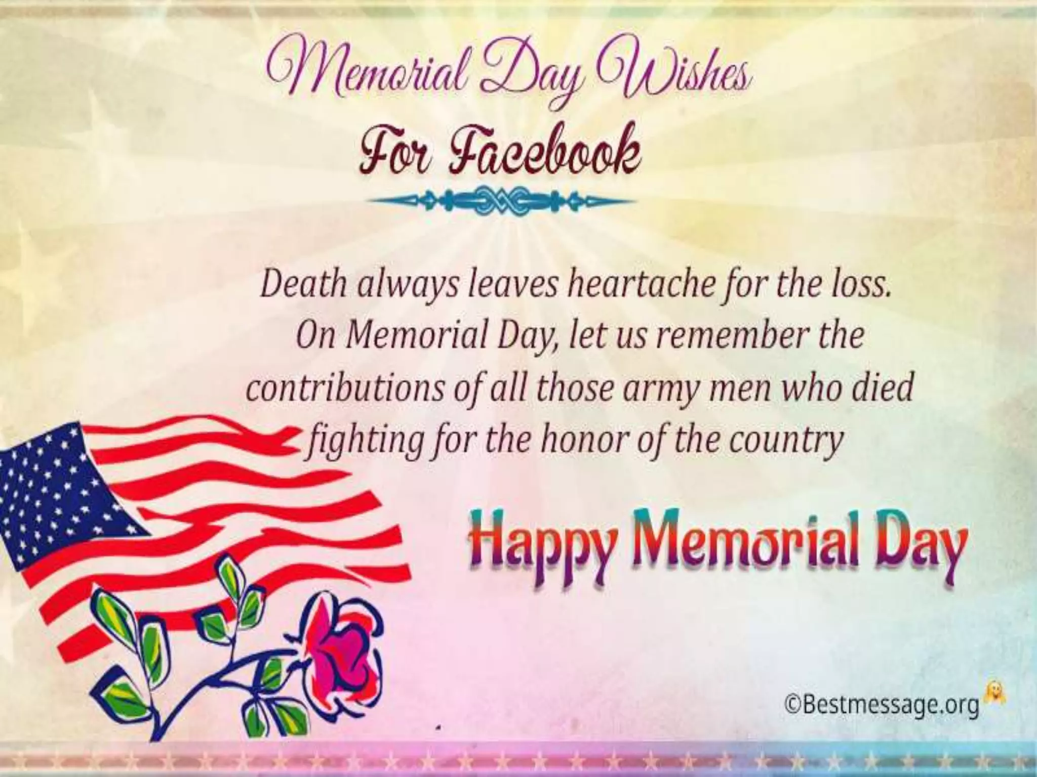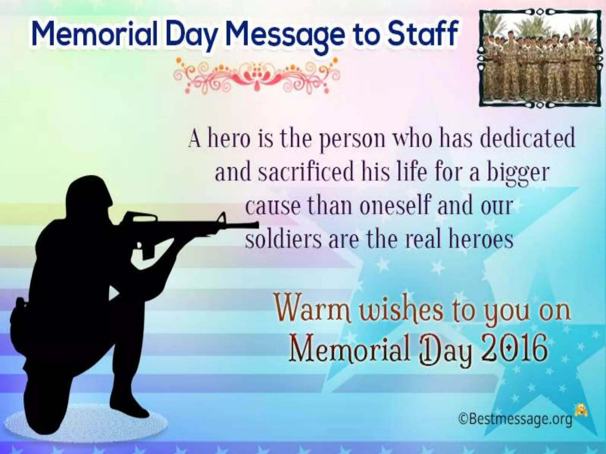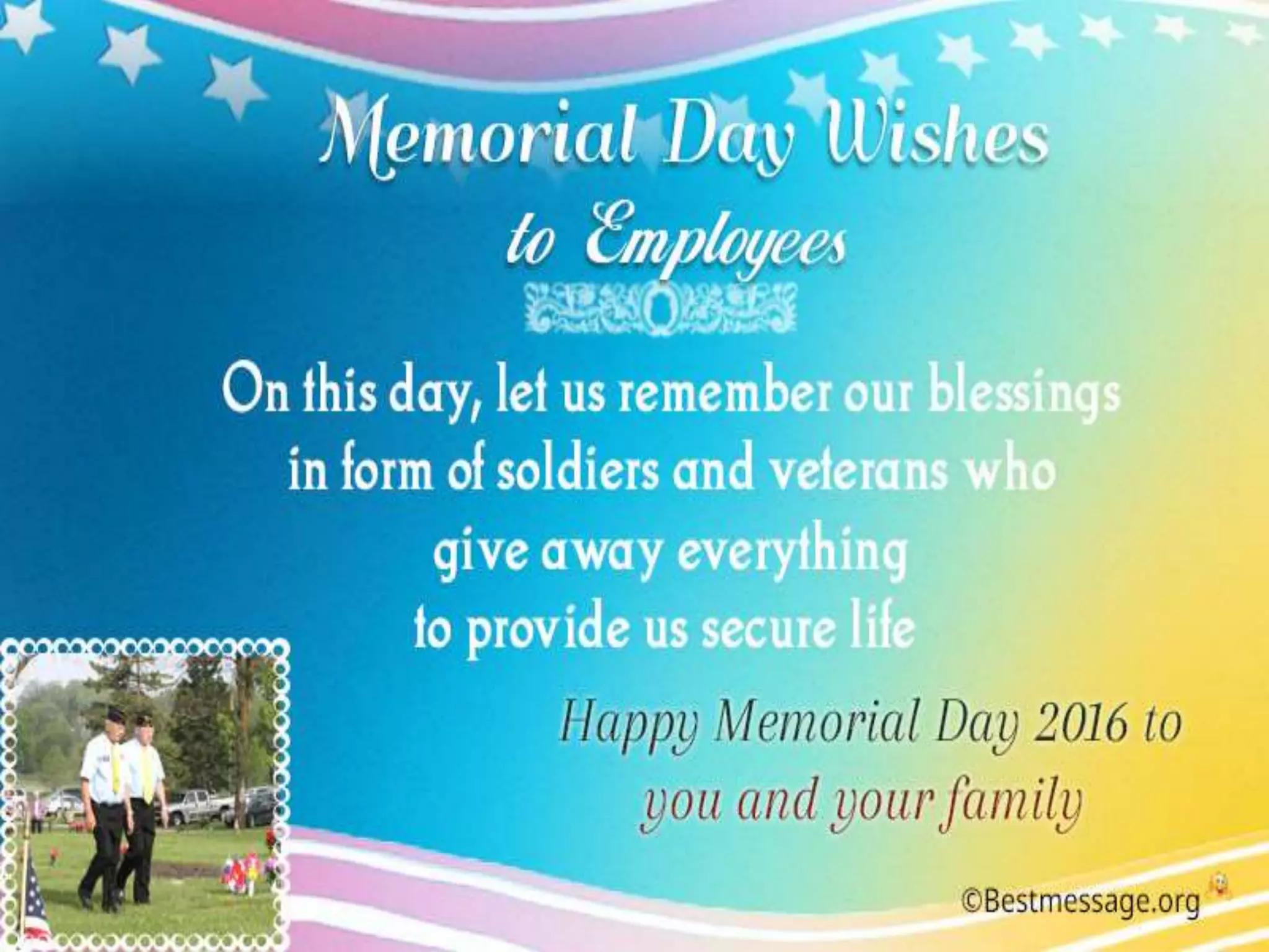 Best collection of Happy Memorial Day 2016 wishes, text messages and sayings to send your friends, veterans or employees on facebook & whatsapp. Here are some of the thoughtful memorial day weekend quotes & greetings on this 30 May 2016.