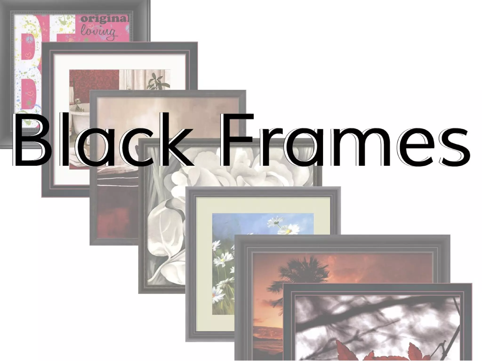The document lists various types of picture frames, detailing their colors and accents, including black, ebony, bronze, gold, and walnut, among others. These frames vary in style, featuring rounded or contemporary designs. The collection reflects a range of aesthetic choices for displaying art or photographs.