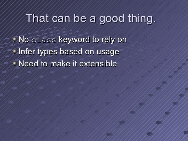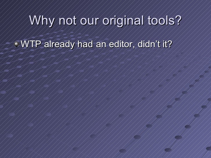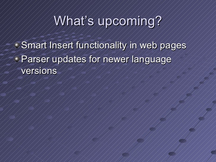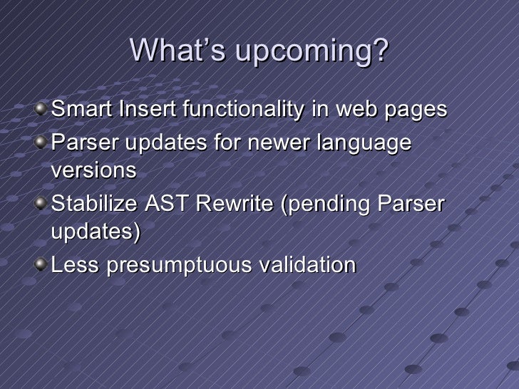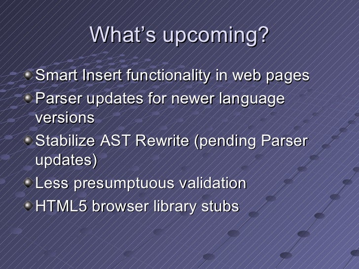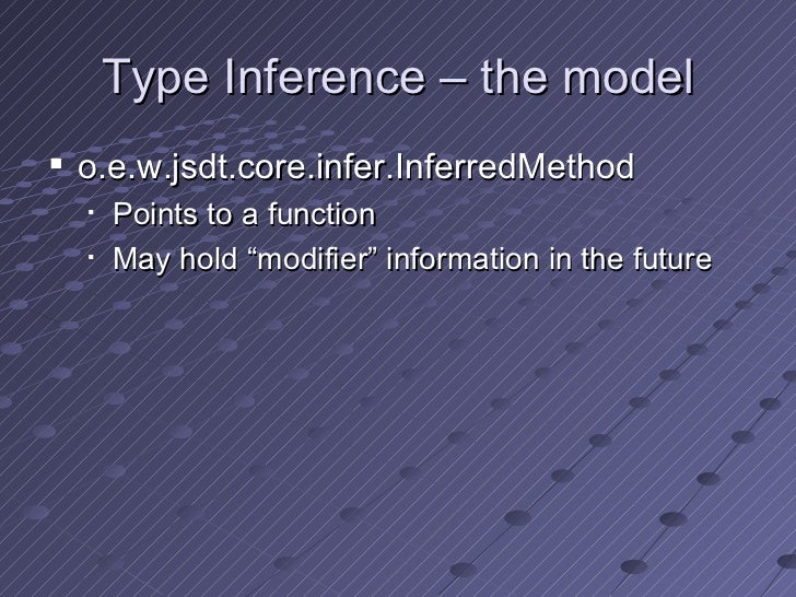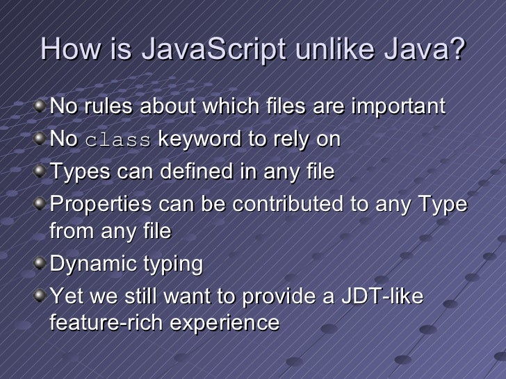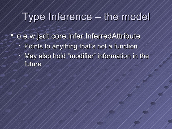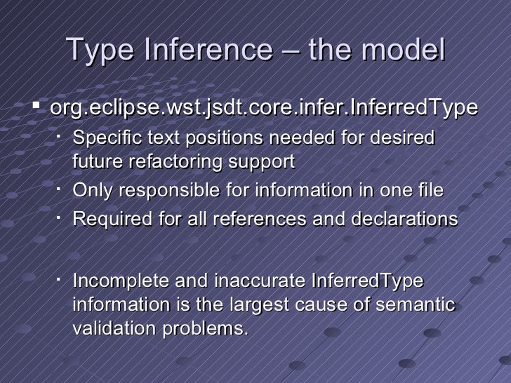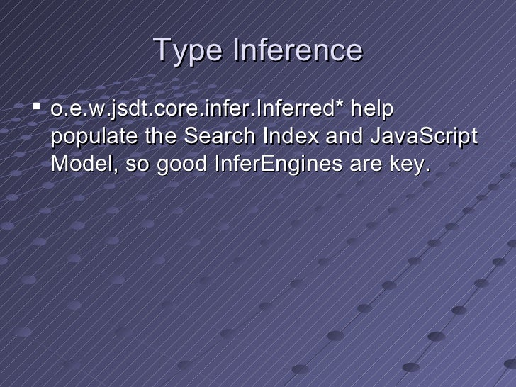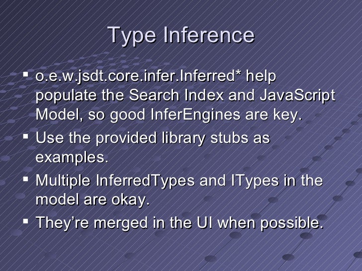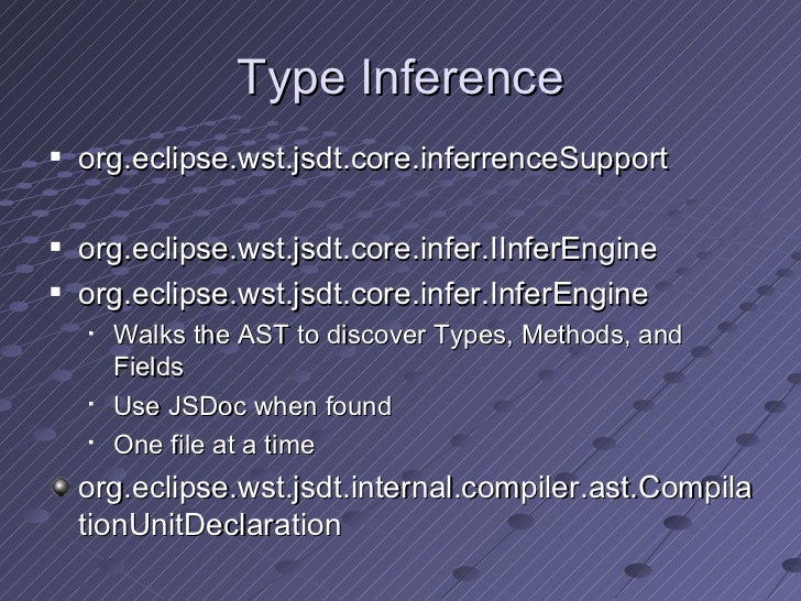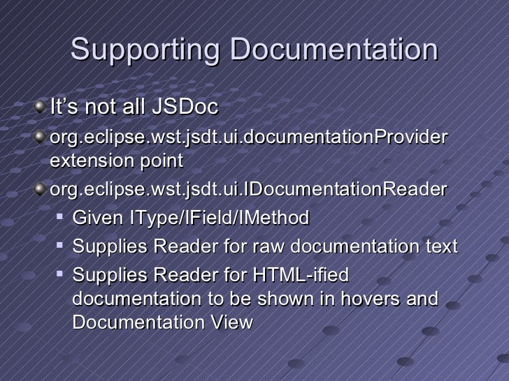 JSDT is the JavaScript IDE now provided within the Web Tools Platform, a vendor neutral, standards oriented basis for web tools in Eclipse. Being vendor neutral, however, means not playing favorites among the many JavaScript toolkits being used to create Web 2.0 sites. Just as WTP offers mechanisms for application server vendors to have first class support within Eclipse, so too does JSDT offer extension points for enriching the experience when working with your JavaScript toolkit of choice. This presentation covers the limitations to JSDT's built-in language support and how to aid it in inferring type information from your sources and leveraging custom documentation formats.