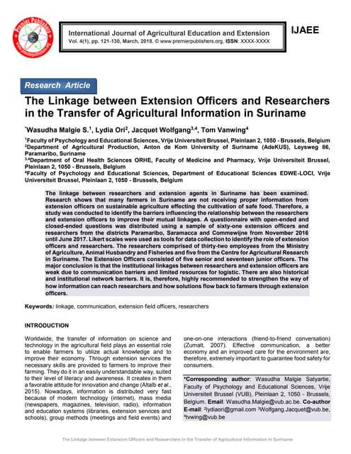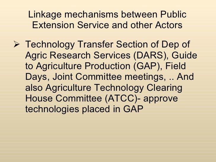 Linkage mechanisms between Public Extension Service and other Actors <ul><li>Technology Transfer Section of Dep of Agric Research Services (DARS), Guide to Agriculture Production (GAP), Field Days, Joint Committee meetings, .. And also Agriculture Technology Clearing House Committee (ATCC)- approve technologies placed in GAP </li></ul>