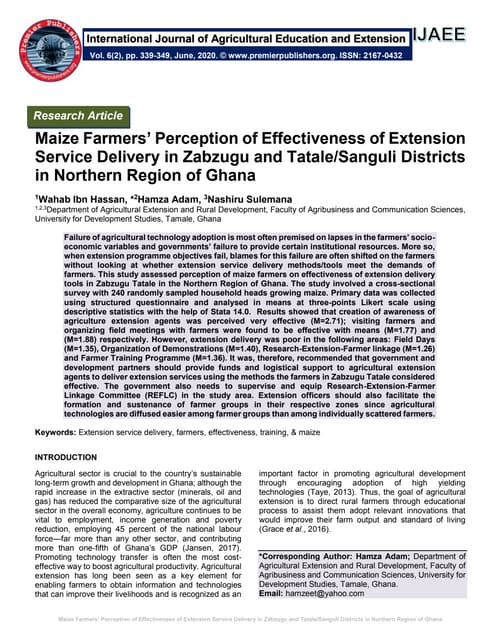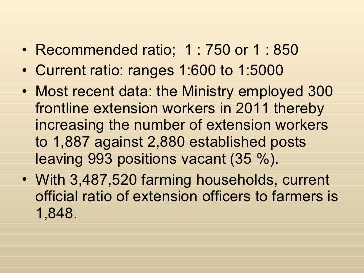 <ul><li>Recommended ratio; 1 : 750 or 1 : 850 </li></ul><ul><li>Current ratio: ranges 1:600 to 1:5000 </li></ul><ul><li>Most recent data: the Ministry employed 300 frontline extension workers in 2011 thereby increasing the number of extension workers to 1,887 against 2,880 established posts leaving 993 positions vacant (35 %). </li></ul><ul><li>With 3,487,520 farming households, current official ratio of extension officers to farmers is 1,848. </li></ul>
