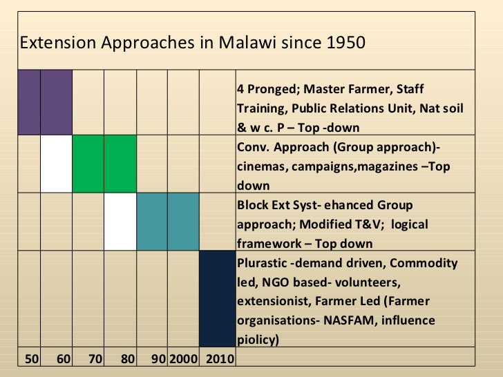 Extension Approaches in Malawi since 1950 4 Pronged; Master Farmer, Staff Training, Public Relations Unit, Nat soil & w c. P – Top -down Conv. Approach (Group approach)-cinemas, campaigns,magazines –Top down Block Ext Syst- ehanced Group approach; Modified T&V; logical framework – Top down Plurastic -demand driven, Commodity led, NGO based- volunteers, extensionist, Farmer Led (Farmer organisations- NASFAM, influence piolicy) 50 60 70 80 90 2000 2010