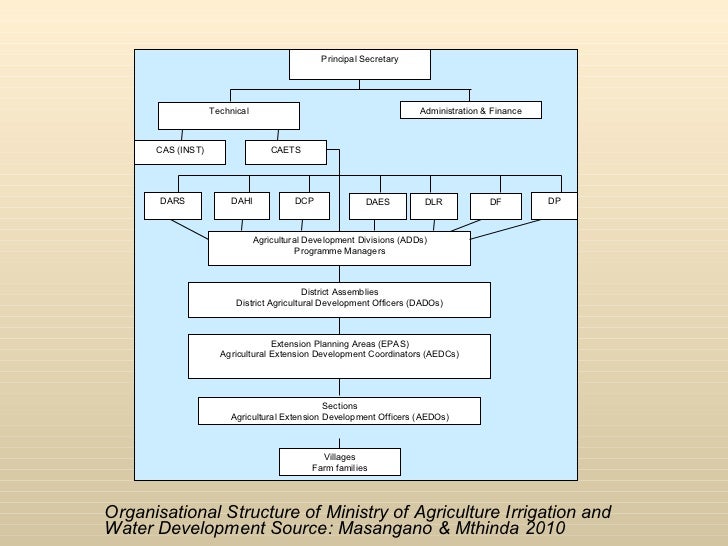 <ul><li>Organisational Structure of Ministry of Agriculture Irrigation and Water Development Source: Masangano & Mthinda 2010 </li></ul><ul><li> </li></ul>Technical Administration & Finance CAETS DAES DLR DF CAS (INST) Agricultural Development Divisions (ADDs) Programme Managers District Assemblies District Agricultural Development Officers (DADOs) Extension Planning Areas (EPAS) Agricultural Extension Development Coordinators (AEDCs) Sections Agricultural Extension Development Officers (AEDOs) DCP DAHI DP DARS Villages Farm families Principal Secretary