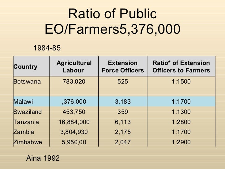 Ratio of Public EO/Farmers 5,376,000 Aina 1992 1984-85 Country Agricultural Labour Extension Force Officers Ratio* of Extension Officers to Farmers Botswana 783,020 525 1:1500 Malawi ,376,000 3,183 1:1700 Swaziland 453,750 359 1:1300 Tanzania 16,884,000 6,113 1:2800 Zambia 3,804,930 2,175 1:1700 Zimbabwe 5,950,00 2,047 1:2900
