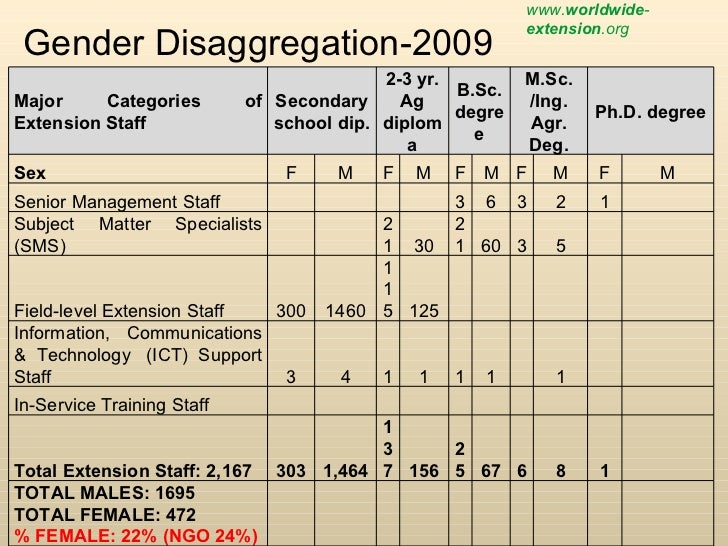 Gender Disaggregation-2009 www. worldwide - extension .org Major Categories of Extension Staff Secondary school dip. 2-3 yr. Ag diploma B.Sc. degree M.Sc. /Ing. Agr. Deg. Ph.D. degree Sex F M F M F M F M F M Senior Management Staff 3 6 3 2 1 Subject Matter Specialists (SMS) 21 30 21 60 3 5 Field-level Extension Staff 300 1460 115 125 Information, Communications & Technology (ICT) Support Staff 3 4 1 1 1 1 1 In-Service Training Staff Total Extension Staff: 2,167 303 1,464 137 156 25 67 6 8 1 TOTAL MALES: 1695 TOTAL FEMALE: 472 % FEMALE: 22% (NGO 24%)