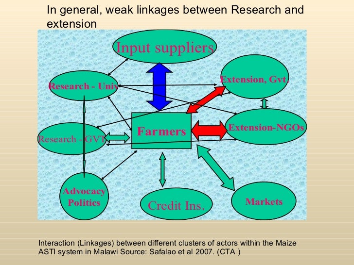 <ul><li>Interaction (Linkages) between different clusters of actors within the Maize </li></ul><ul><li>ASTI system in Malawi Source: Safalao et al 2007. (CTA ) </li></ul>In general, weak linkages between Research and extension
