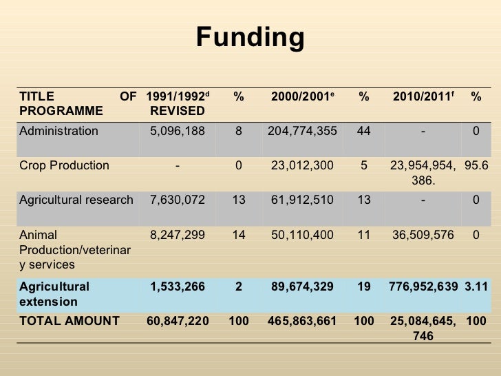 Funding TITLE OF PROGRAMME 1991/1992 d REVISED % 2000/2001 e % 2010/2011 f % Administration 5,096,188 8 204,774,355 44 - 0 Crop Production - 0 23,012,300 5 23,954,954,386. 95.6 Agricultural research 7,630,072 13 61,912,510 13 - 0 Animal Production/veterinary services 8,247,299 14 50,110,400 11 36,509,576 0 Agricultural extension 1,533,266 2 89,674,329 19 776,952,639 3.11 TOTAL AMOUNT 60,847,220 100 465,863,661 100 25,084,645,746 100