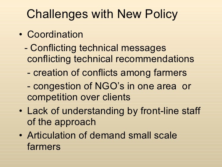Challenges with New Policy <ul><li>Coordination </li></ul><ul><li>- Conflicting technical messages conflicting technical recommendations </li></ul><ul><li>- creation of conflicts among farmers </li></ul><ul><li>- congestion of NGO’s in one area or competition over clients </li></ul><ul><li>Lack of understanding by front-line staff of the approach </li></ul><ul><li>Articulation of demand small scale farmers </li></ul>