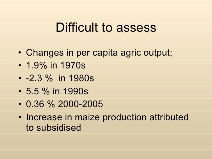Difficult to assess <ul><li>Changes in per capita agric output; </li></ul><ul><li>1.9% in 1970s </li></ul><ul><li>-2.3 % in 1980s </li></ul><ul><li>5.5 % in 1990s </li></ul><ul><li>0.36 % 2000-2005 </li></ul><ul><li>Increase in maize production attributed to subsidised </li></ul>