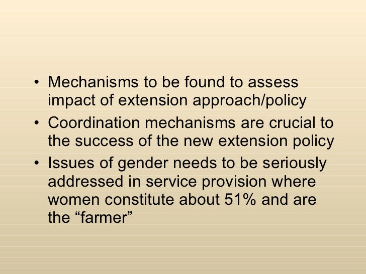 <ul><li>Mechanisms to be found to assess impact of extension approach/policy </li></ul><ul><li>Coordination mechanisms are crucial to the success of the new extension policy </li></ul><ul><li>Issues of gender needs to be seriously addressed in service provision where women constitute about 51% and are the “farmer” </li></ul>