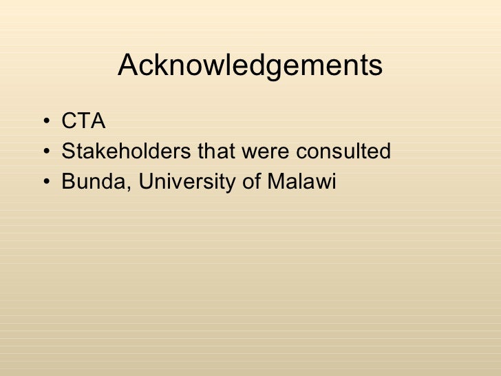 Acknowledgements <ul><li>CTA </li></ul><ul><li>Stakeholders that were consulted </li></ul><ul><li>Bunda, University of Malawi </li></ul>