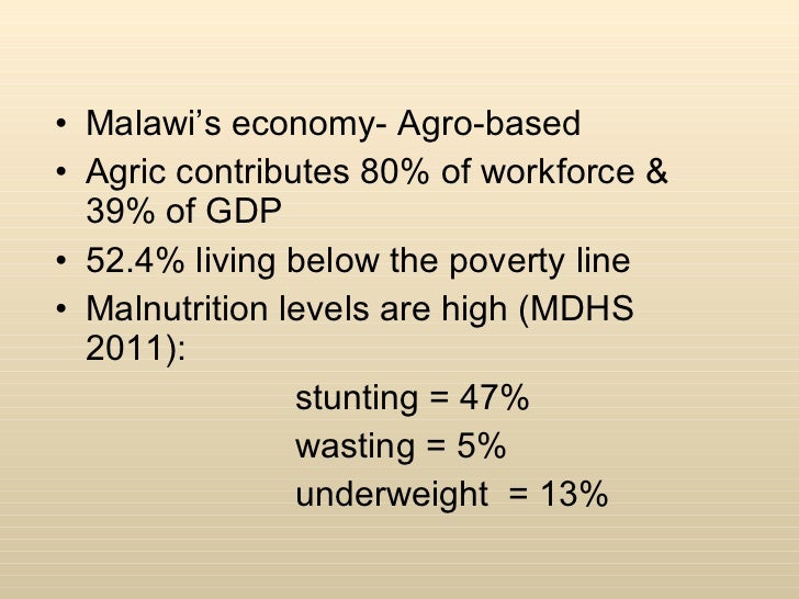 <ul><li>Malawi’s economy- Agro-based </li></ul><ul><li>Agric contributes 80% of workforce & 39% of GDP </li></ul><ul><li>52.4% living below the poverty line </li></ul><ul><li>Malnutrition levels are high (MDHS 2011): </li></ul><ul><li>stunting = 47% </li></ul><ul><li>wasting = 5% </li></ul><ul><li>underweight = 13% </li></ul>
