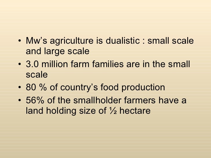 <ul><li>Mw’s agriculture is dualistic : small scale and large scale </li></ul><ul><li>3.0 million farm families are in the small scale </li></ul><ul><li>80 % of country’s food production </li></ul><ul><li>56% of the smallholder farmers have a land holding size of ½ hectare </li></ul>