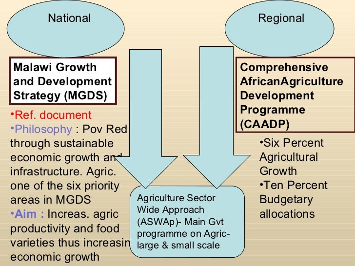 Malawi Growth and Development Strategy (MGDS) National Regional Comprehensive AfricanAgriculture Development Programme (CAADP) <ul><li>Ref. document </li></ul><ul><li>Philosophy : Pov Red through sustainable economic growth and infrastructure. Agric. one of the six priority areas in MGDS </li></ul><ul><li>Aim : Increas. agric productivity and food varieties thus increasing economic growth </li></ul><ul><li>Six Percent Agricultural Growth </li></ul><ul><li>Ten Percent Budgetary allocations </li></ul>Agriculture Sector Wide Approach (ASWAp)- Main Gvt programme on Agric- large & small scale