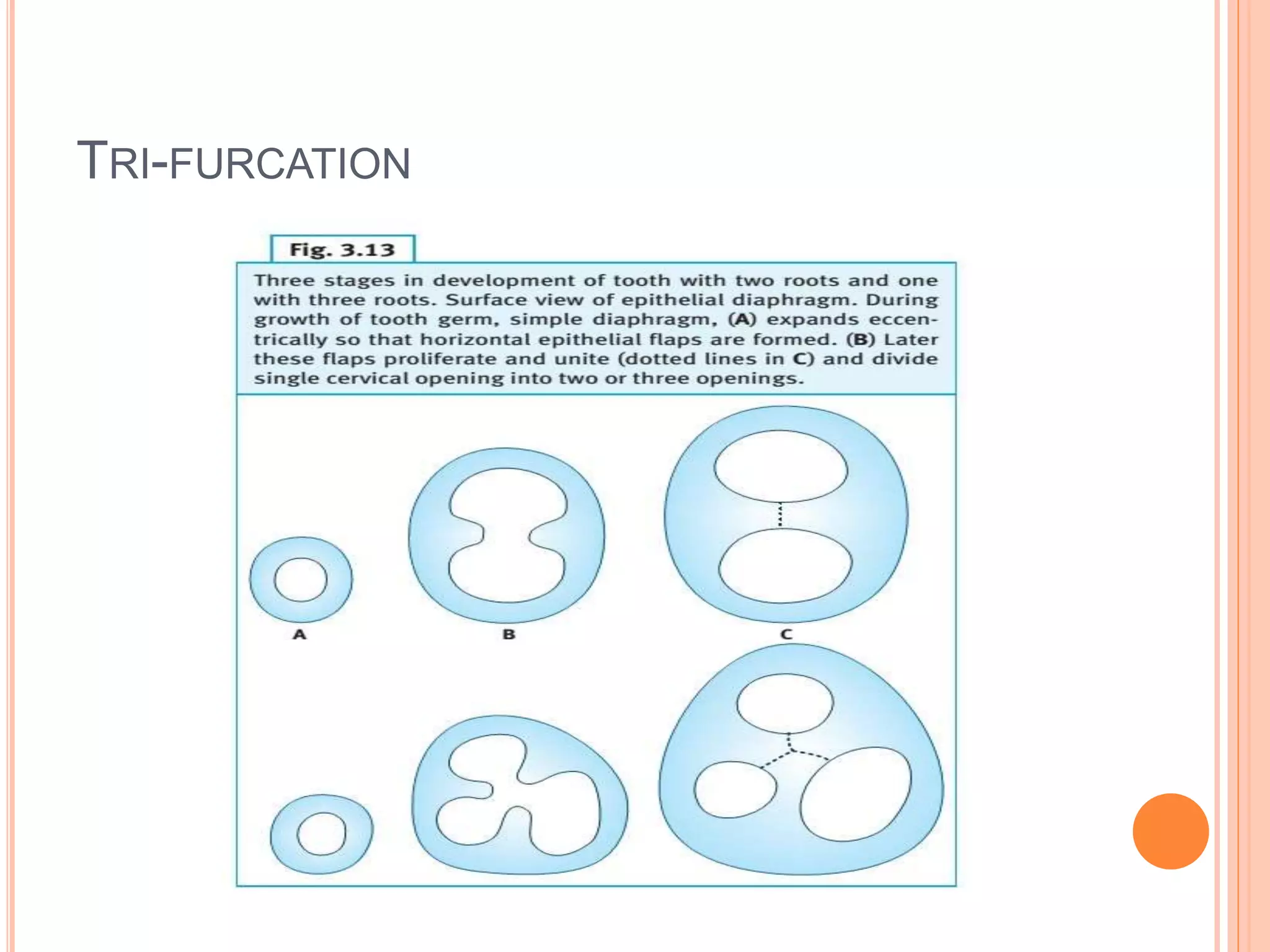 The document discusses the stages of tooth development from the primary epithelial band through root formation and anomalies. It describes how the dental lamina forms and how permanent teeth develop from the successor lamina on the lingual side of predecessor teeth. The main stages of tooth development discussed are the bud stage, cap stage, bell stages (early, late), apposition and root formation. It also lists some anomalies of tooth development such as enamel pearls, supernumerary teeth, and accessory root canals.