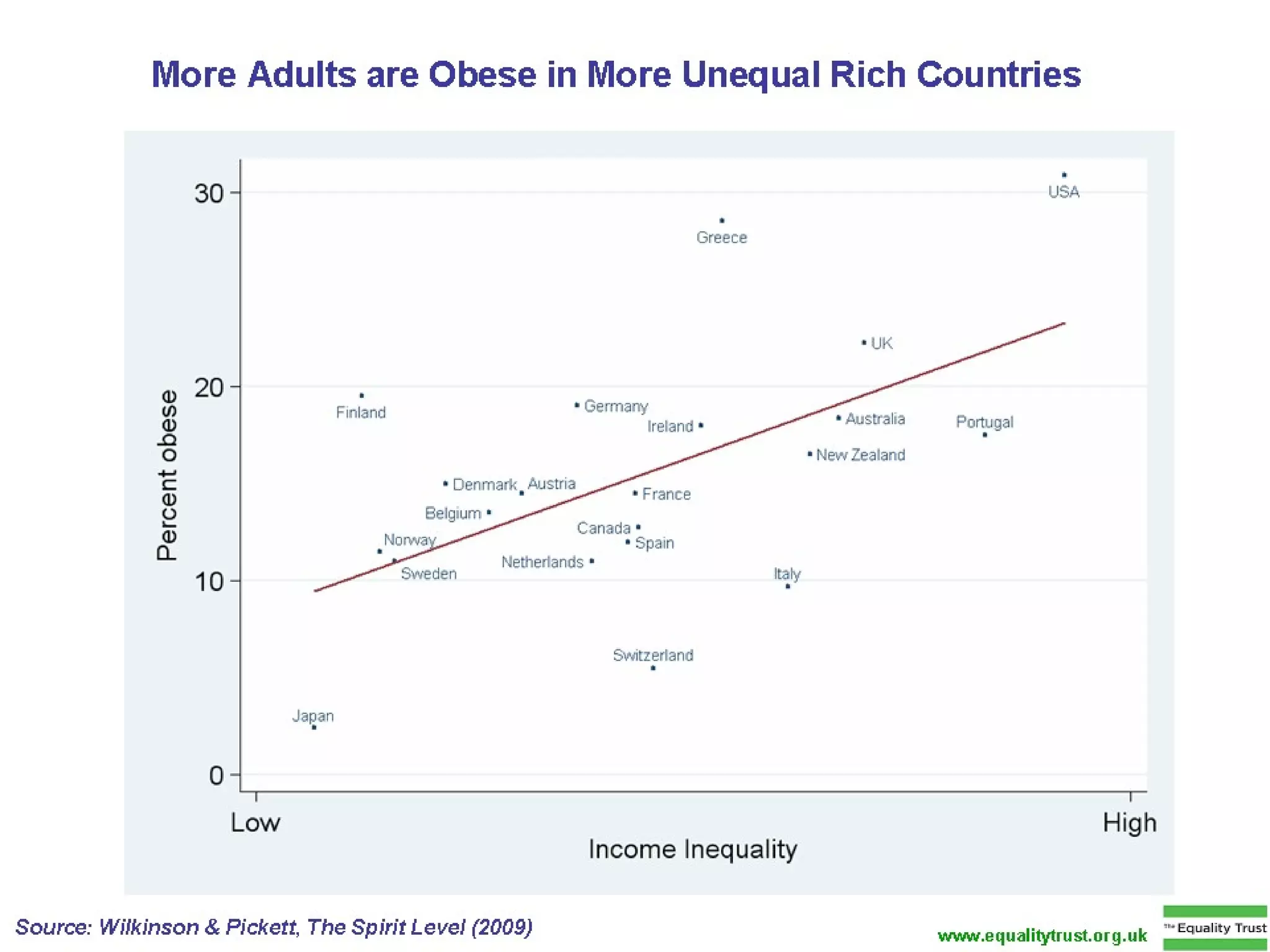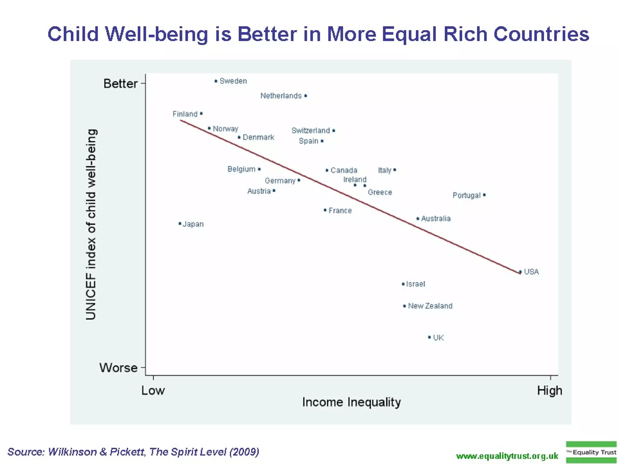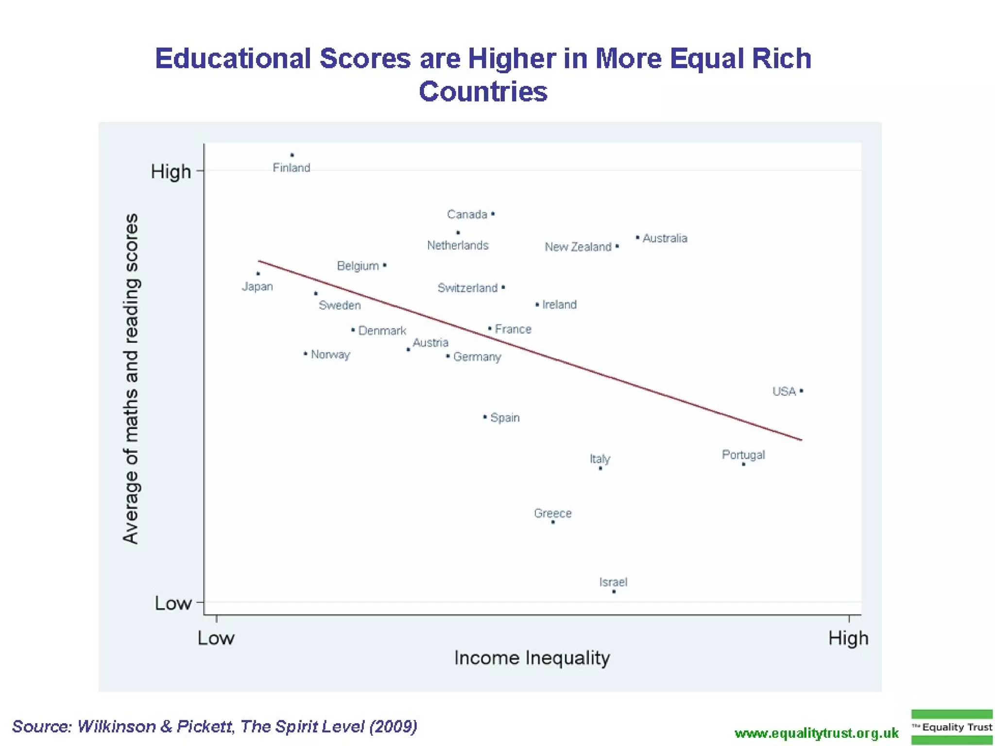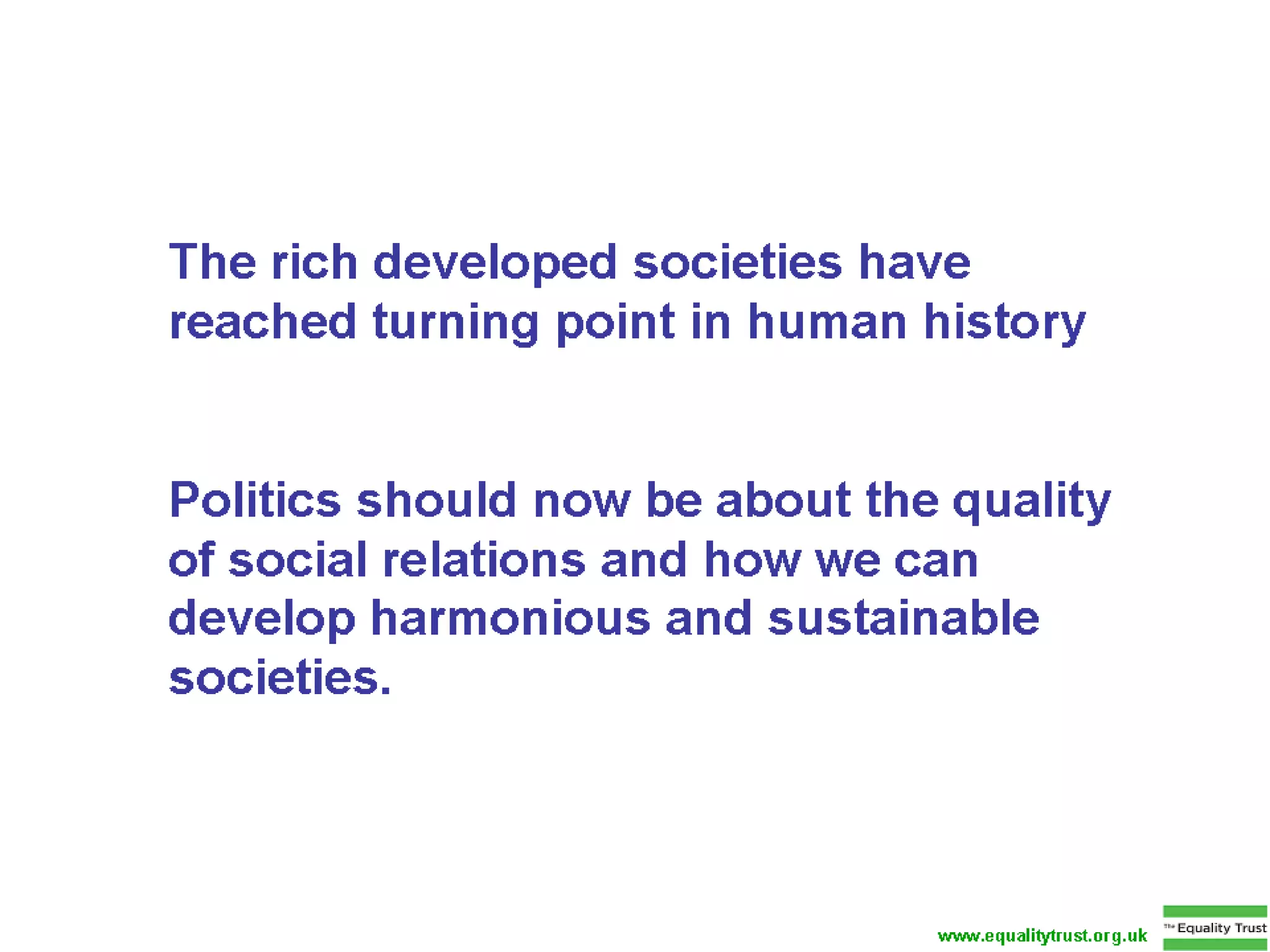 This PowerPoint file contains 36 of the more important graphs published in The Spirit Level: Why More Equal Societies Almost Always Do Better by Richard Wilkinson and Kate Pickett. We hope you will use them in talks, lectures or discussion groups to help increase people's understanding of the effects of inequality. The slides can be downloaded and are provided on condition you acknowledge their source. We strongly recommend that you use them in conjunction with the book which explains the relationships shown in the graphs. Find out more from www.equalitytrust.org.uk