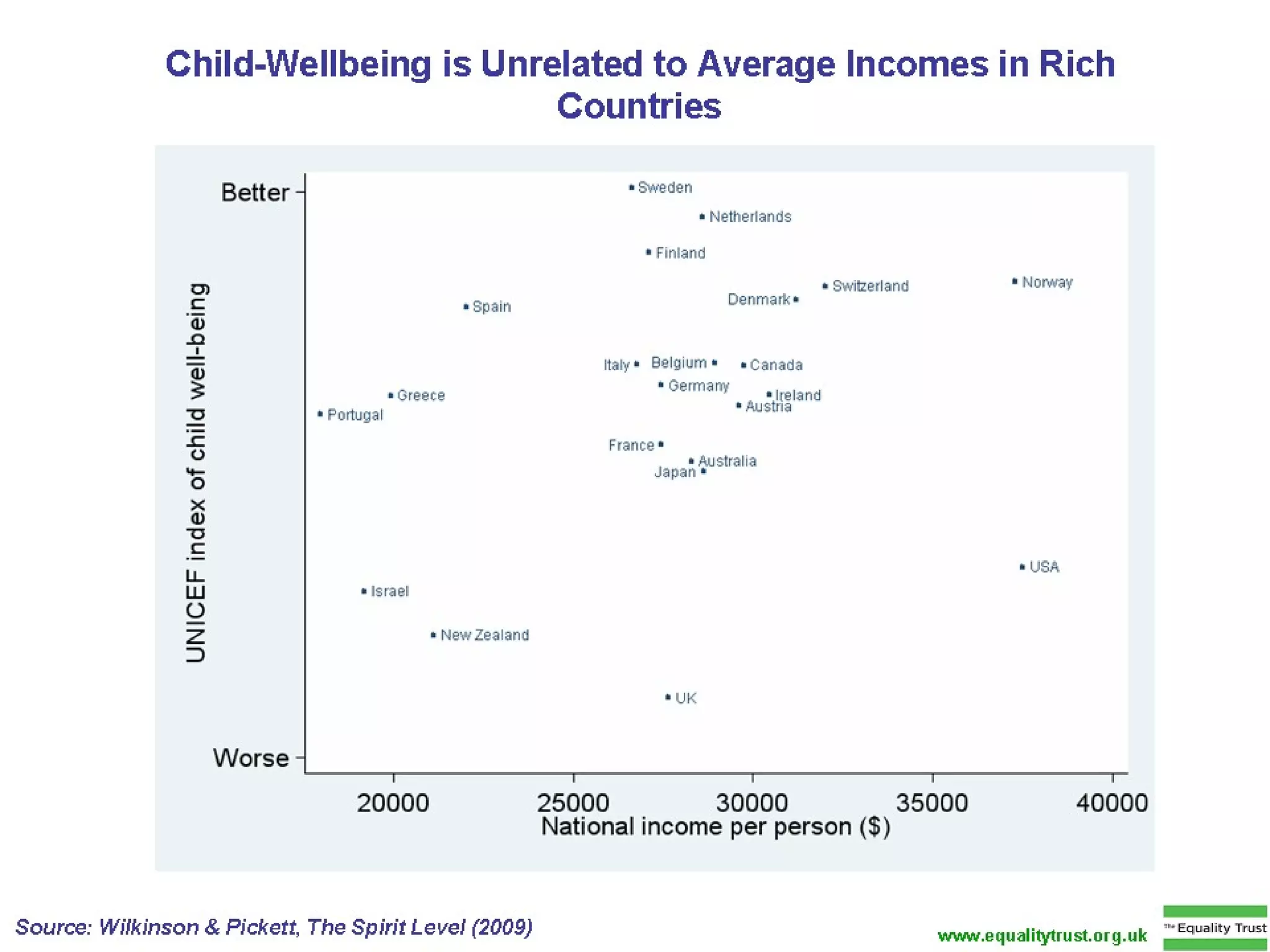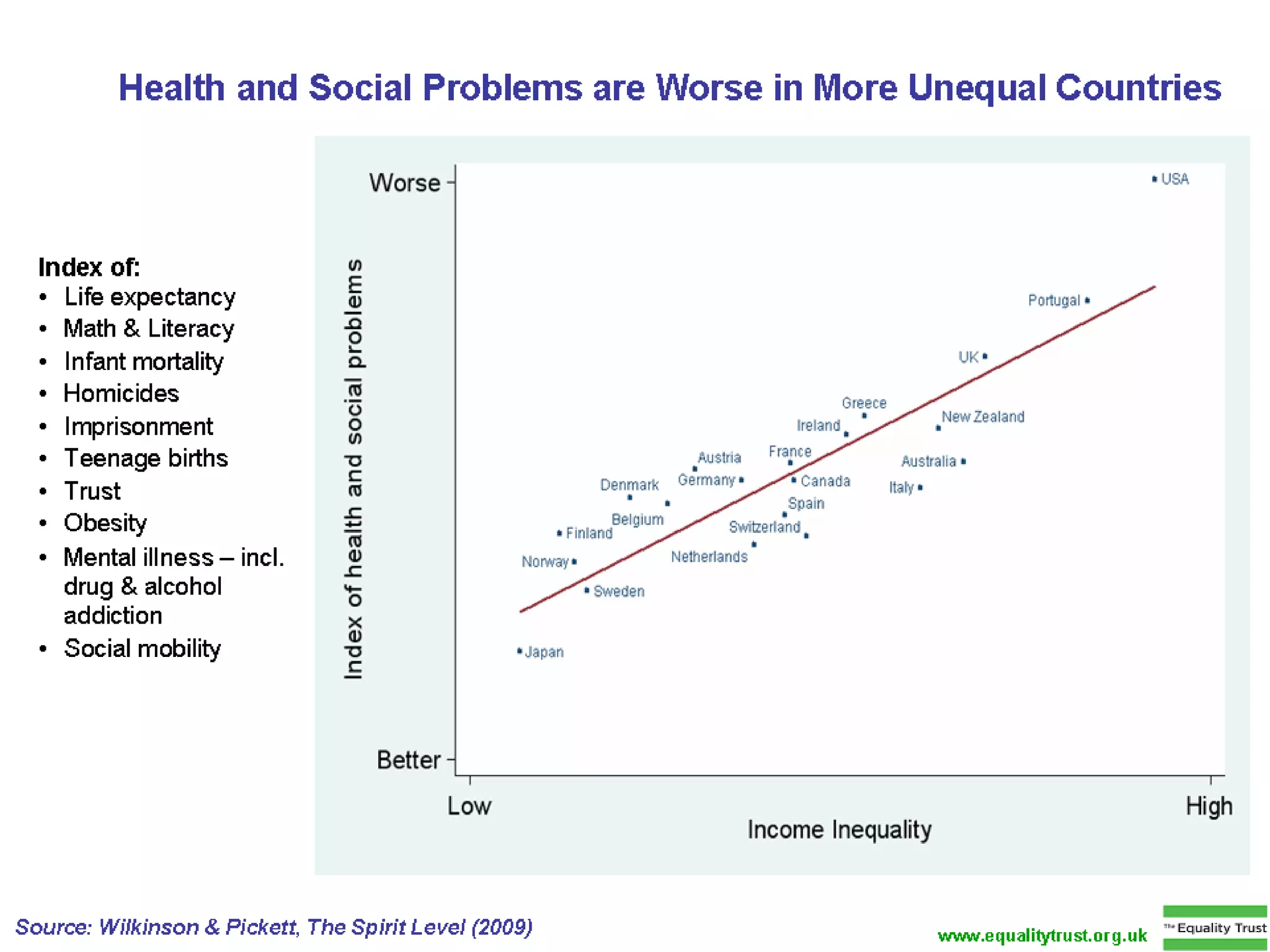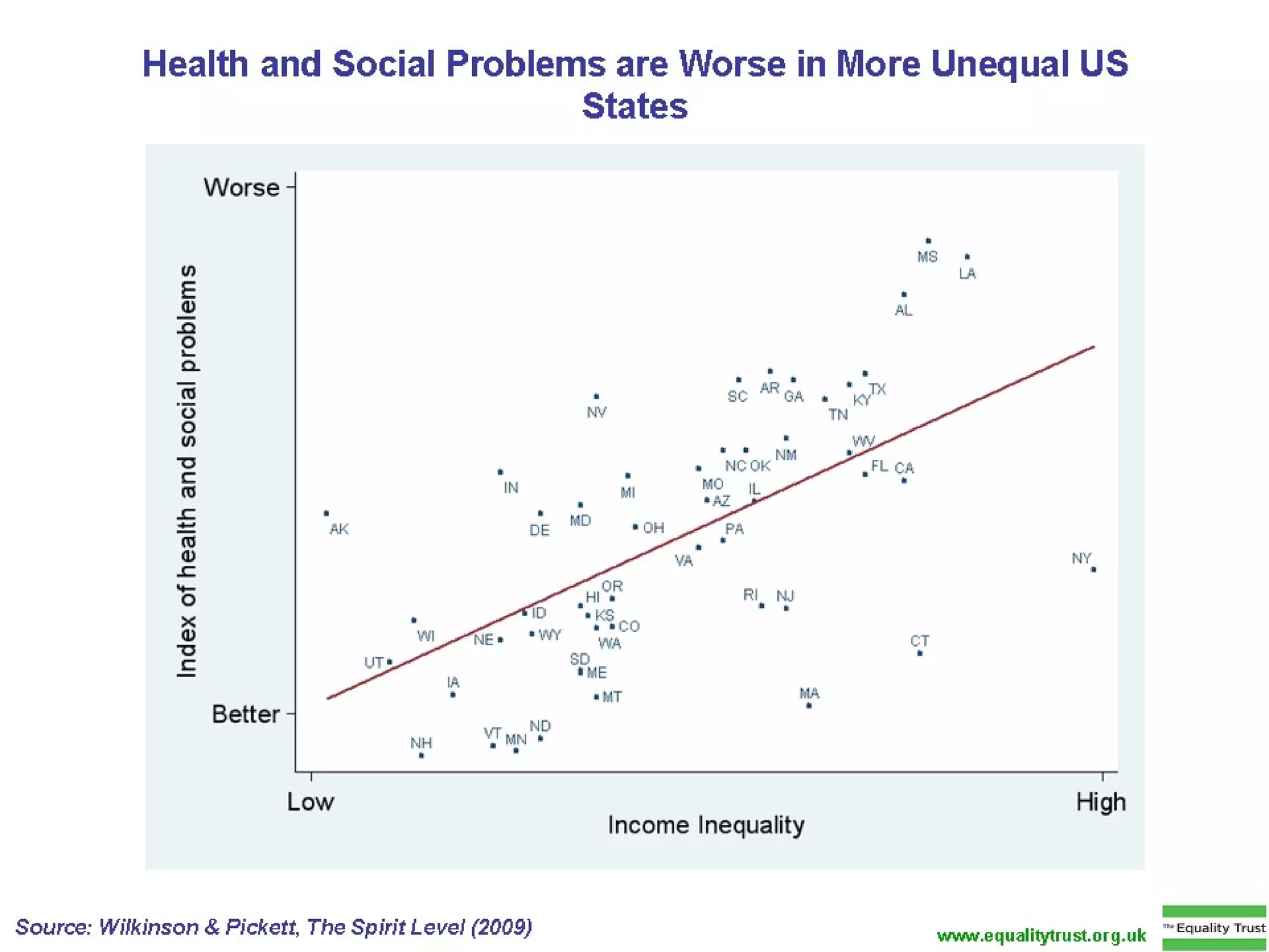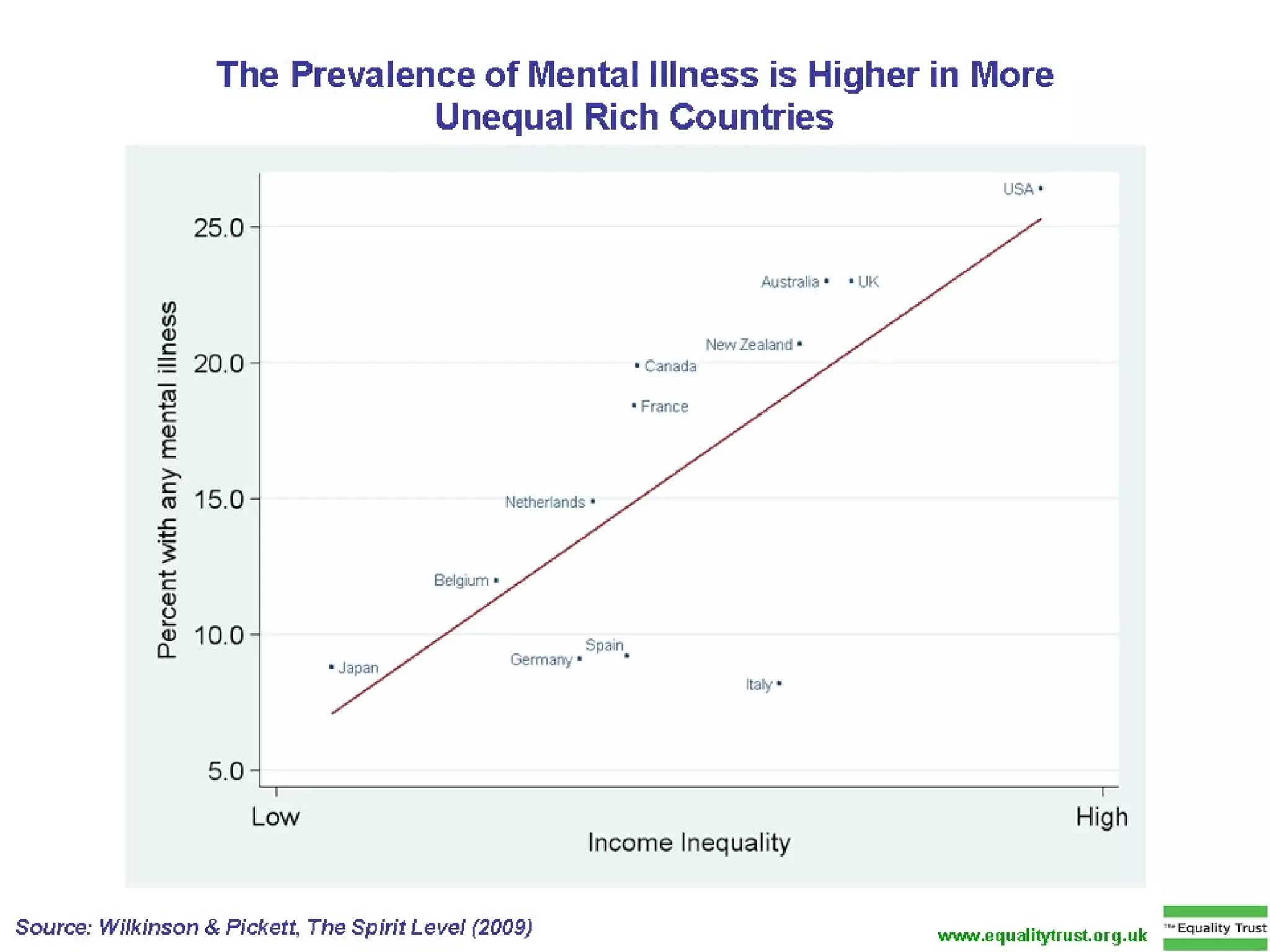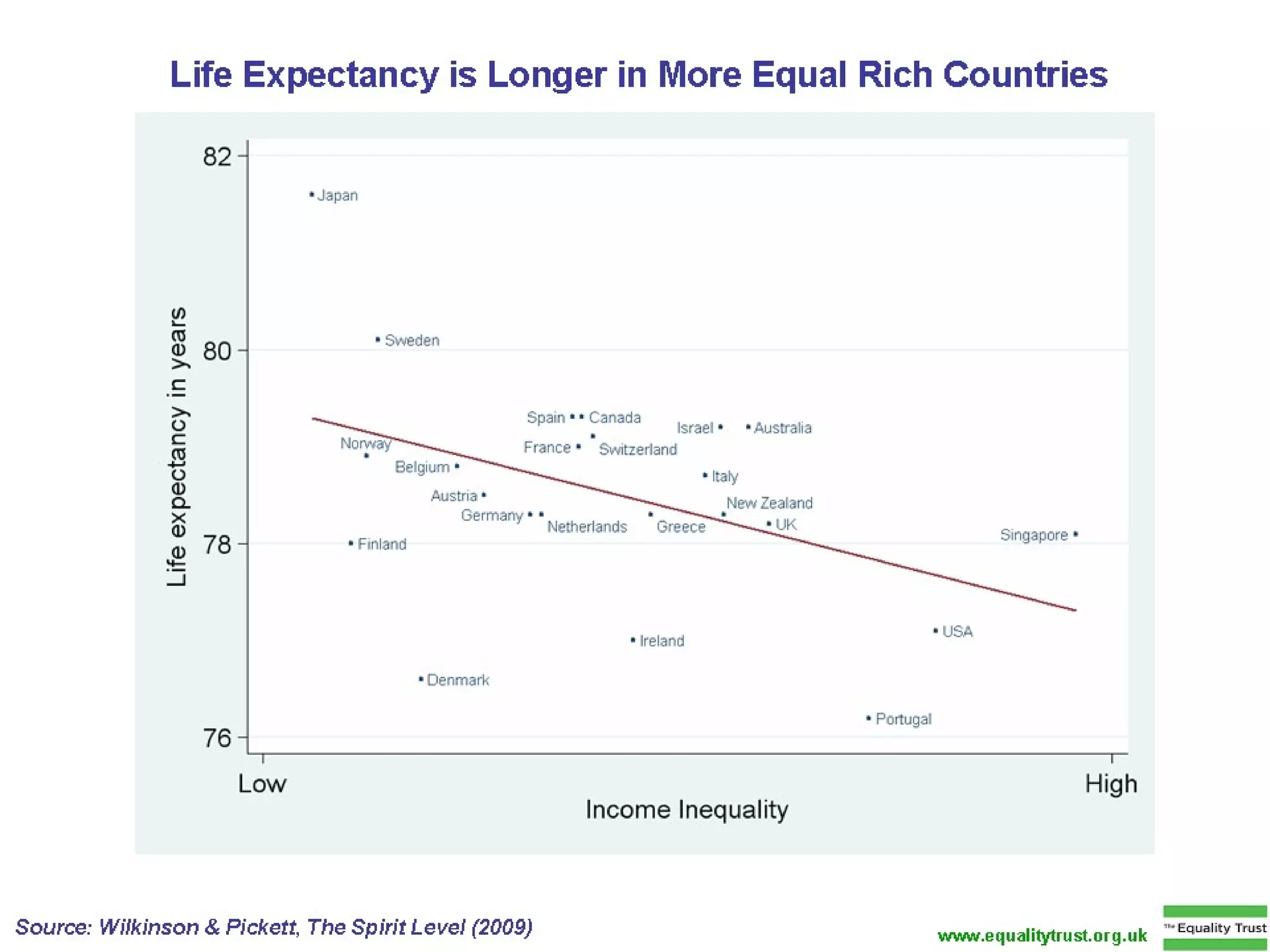 This PowerPoint file contains 36 of the more important graphs published in The Spirit Level: Why More Equal Societies Almost Always Do Better by Richard Wilkinson and Kate Pickett. We hope you will use them in talks, lectures or discussion groups to help increase people's understanding of the effects of inequality. The slides can be downloaded and are provided on condition you acknowledge their source. We strongly recommend that you use them in conjunction with the book which explains the relationships shown in the graphs. Find out more from www.equalitytrust.org.uk