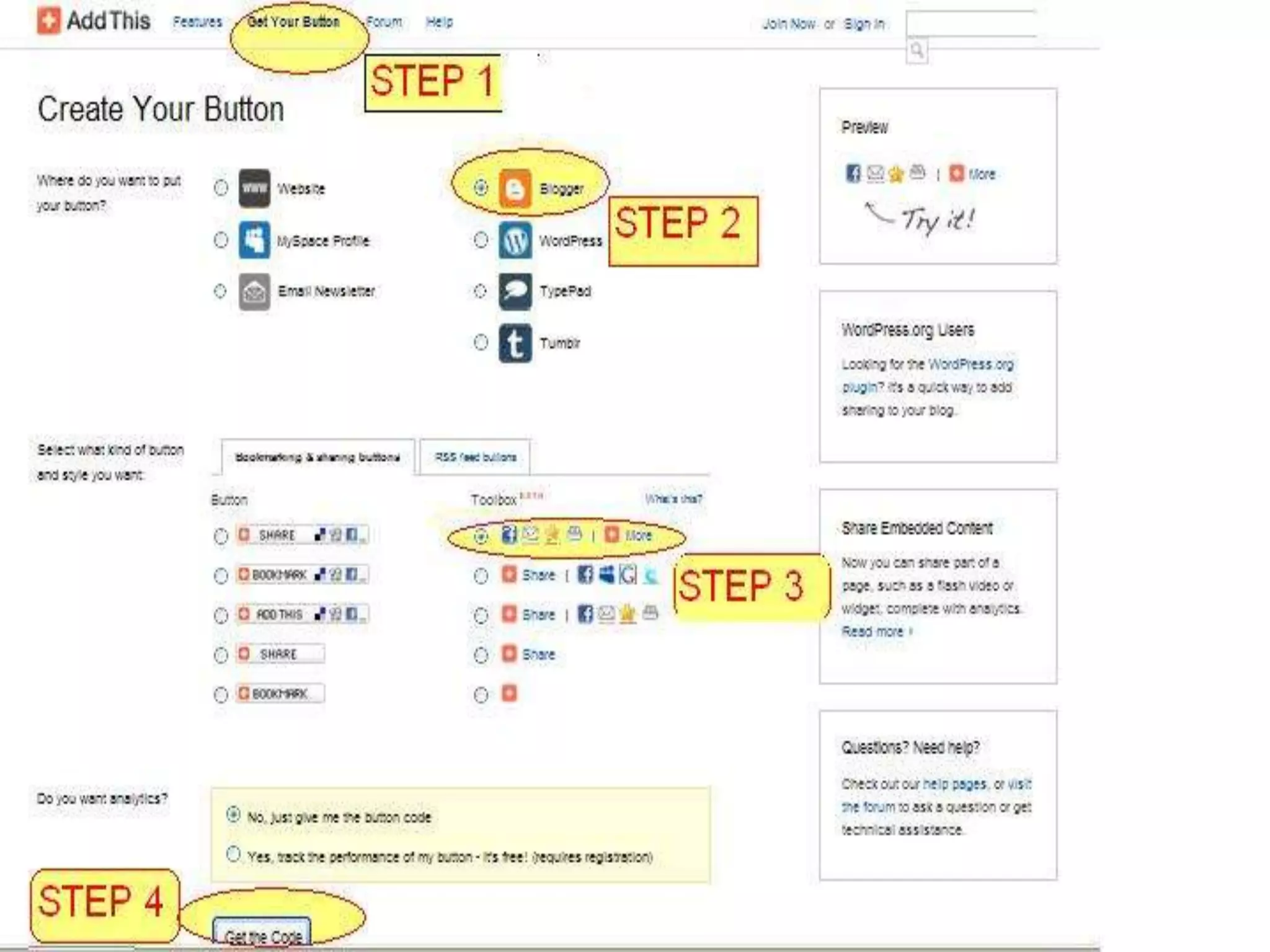 The document provides a guide on how to add an AddThis sharing and bookmarking button to a Blogger post. It outlines steps for adding the button either after each post or in the post footer by editing the HTML template. Users are instructed to find specific tags and paste the provided code from AddThis.com to complete the integration.