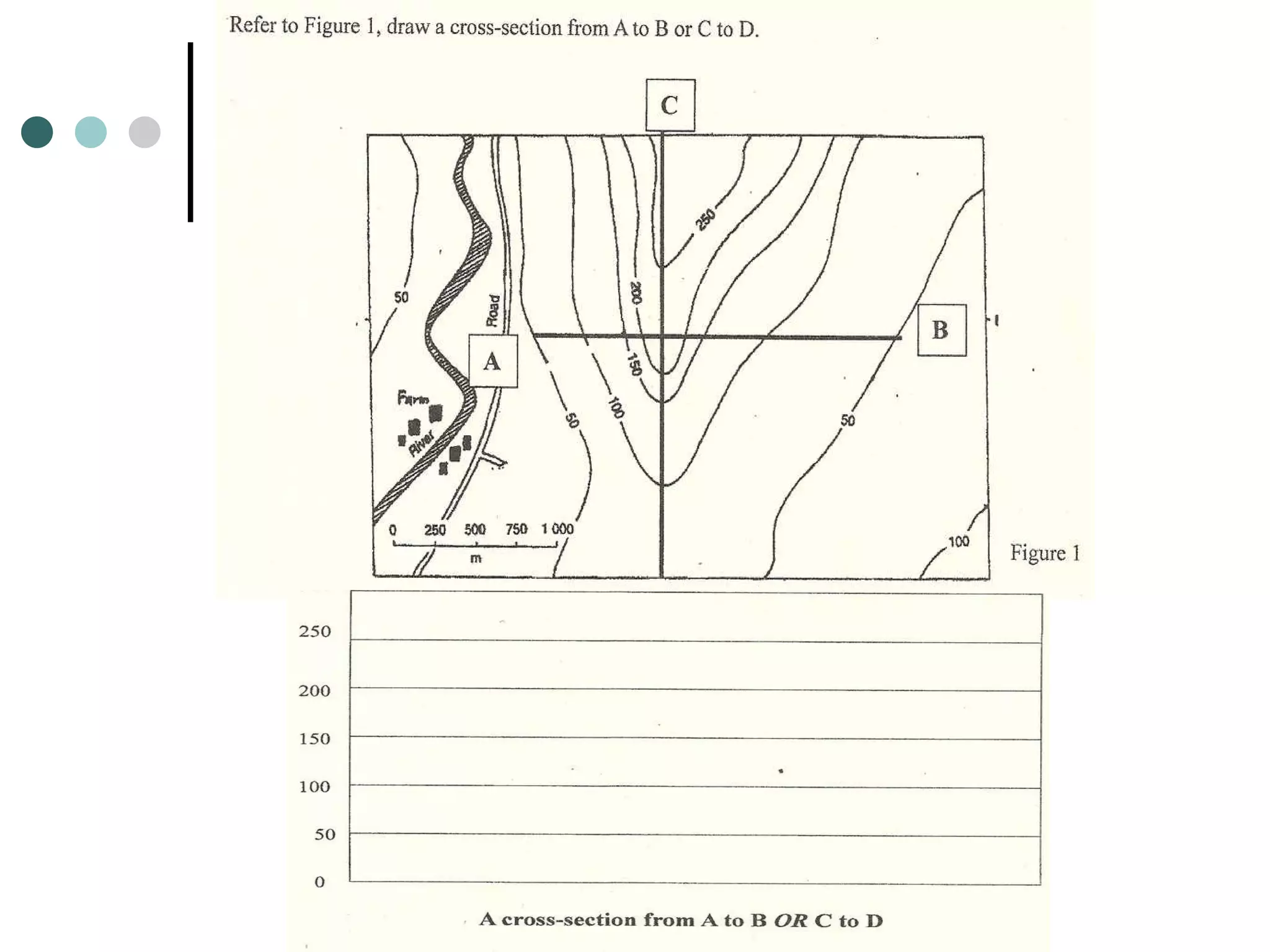This document provides instructions for how to draw a cross section. A cross section shows a cut through an object and tells us the relief or shape and height of the land. The steps guide the reader on how to draw a cross section, which involves cutting through an object and showing the internal structure in a side view.