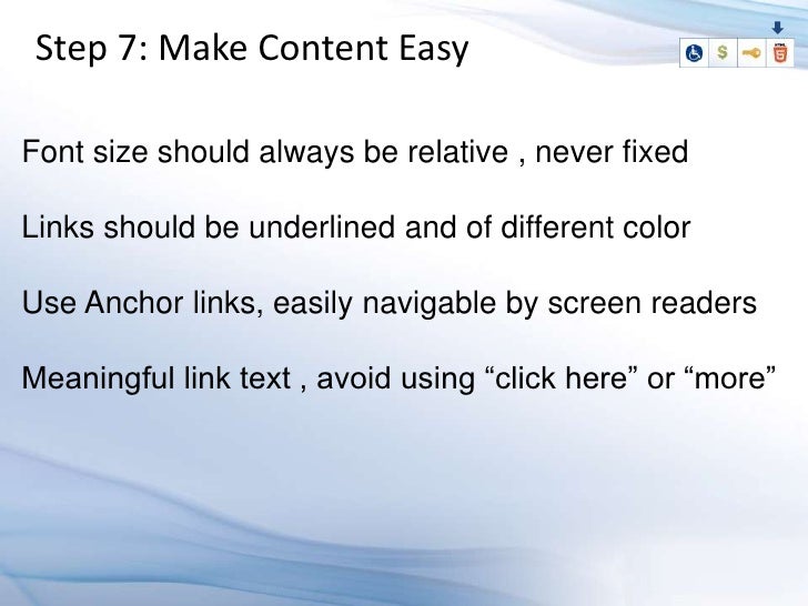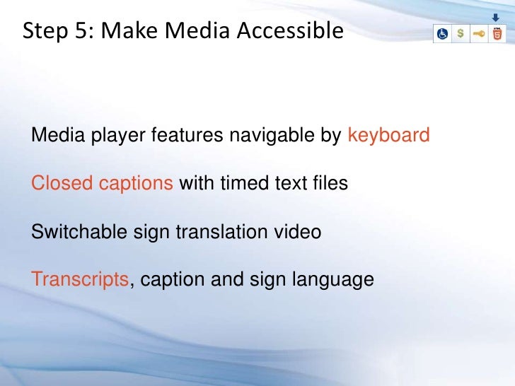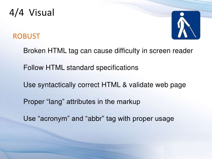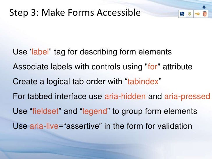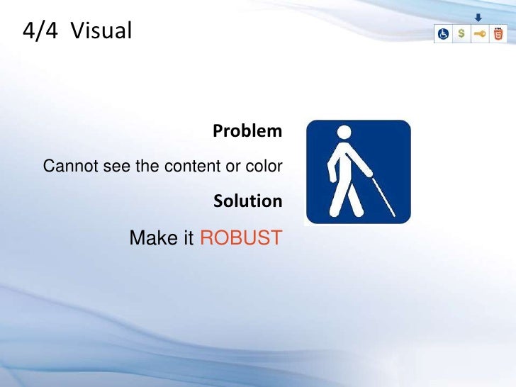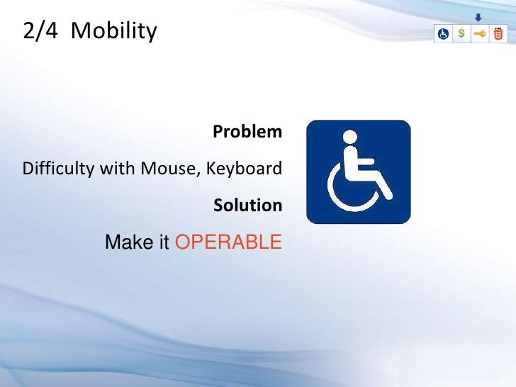Learn how to design an HTML5 application which supports people with disabilities, and know why its a good business decision. An accessible web application gives maximum reach to your application's information, functionalities and benefits, by allowing multiple input methods, different interaction models, and customization based on special needs and limited device supports. The four major disabilities that effect user capabilities are visual, hearing, mobility (difficulty in using the mouse), and cognitive disabilities, which are related to learning abilities. Know how to use the latest technologies to accommodate these users in the user interface.