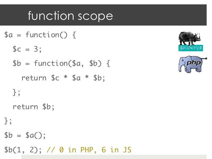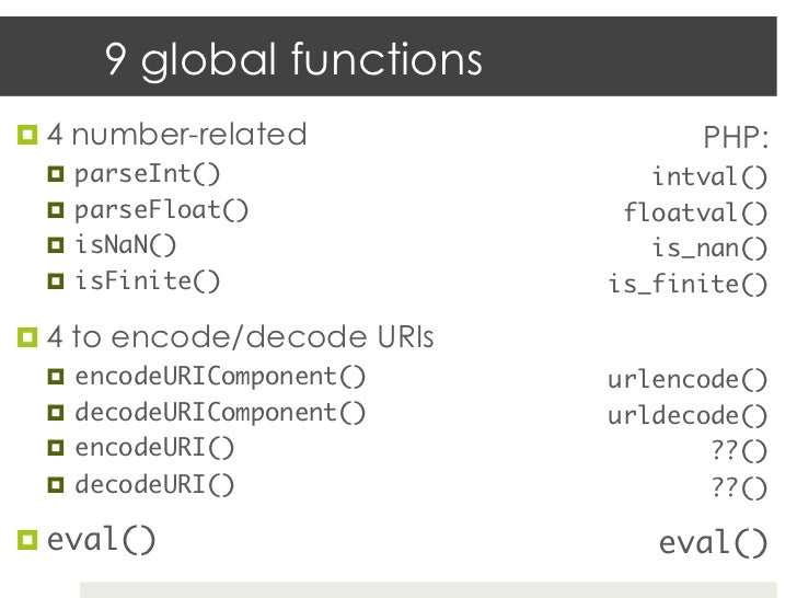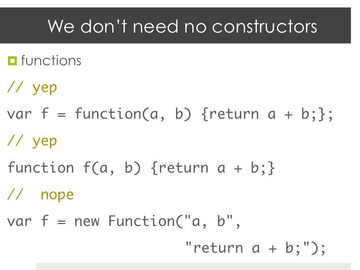 We don’t need no constructors¤ functions // yep var f = function(a, b) {return a + b;}; // yep function f(a, b) {return a + b;} // nope var f = new Function("a, b", "return a + b;");