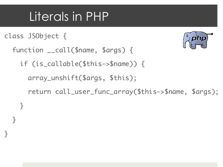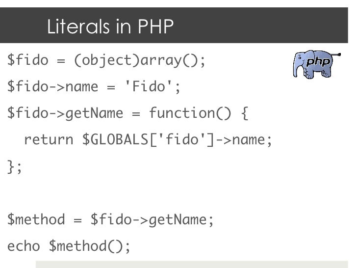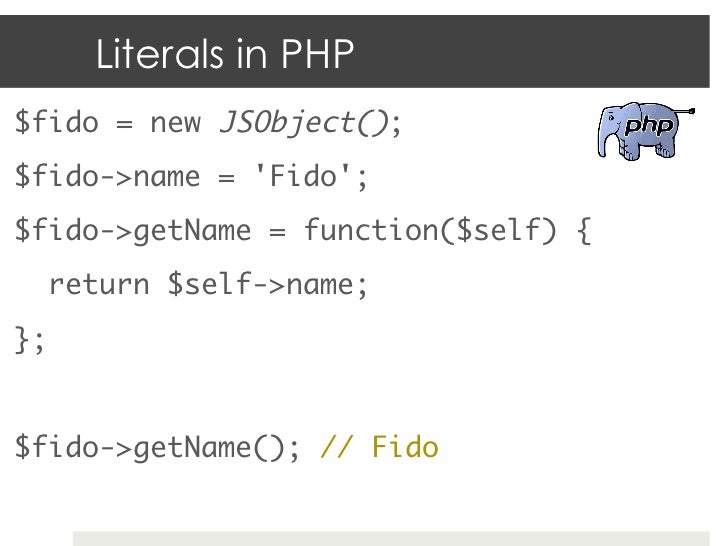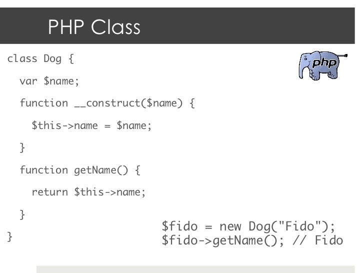 PHP Classclass Dog { var $name; function __construct($name) { $this->name = $name; } function getName() { return $this->name; } $fido = new Dog("Fido"); } $fido->getName(); // Fido