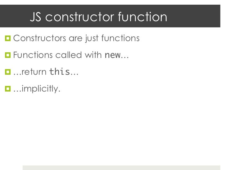 JS constructor function¤ Constructors are just functions¤ Functions called with new… ¤ …return this… ¤ …implicitly.