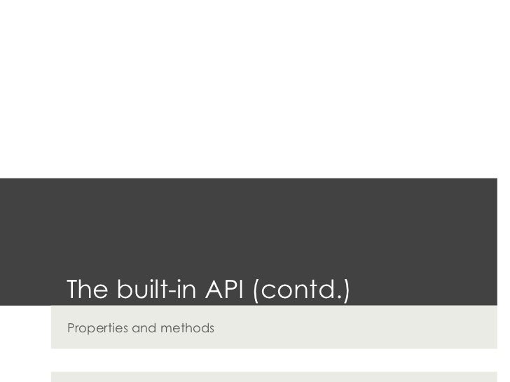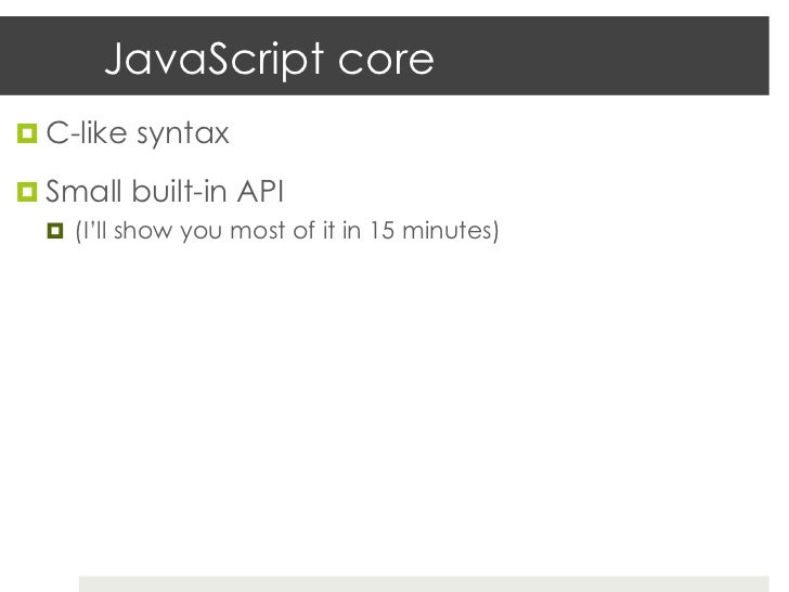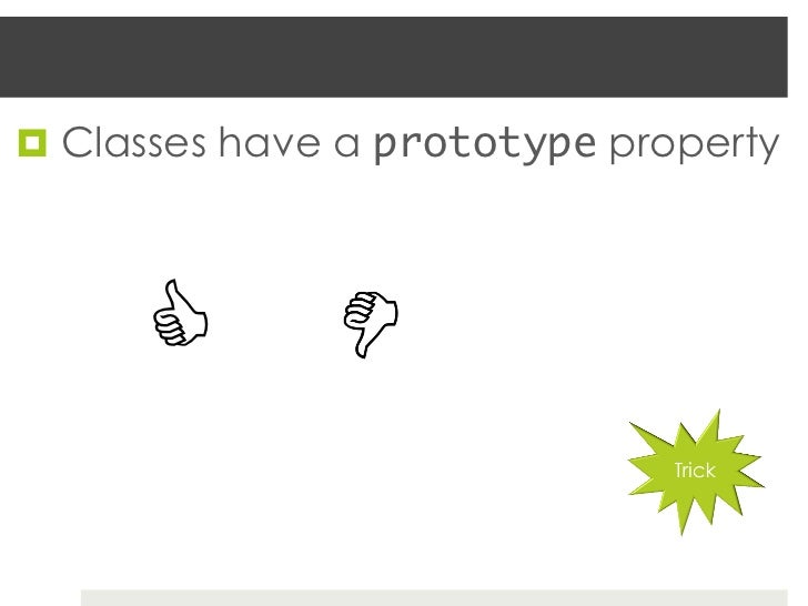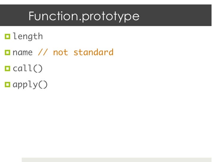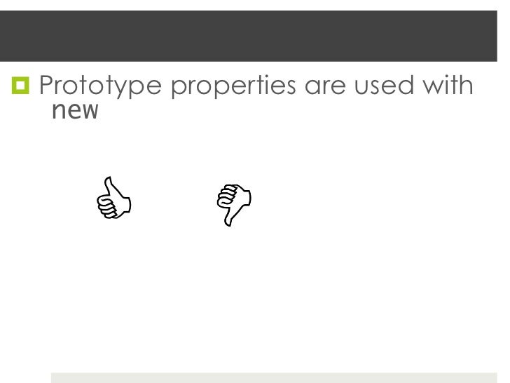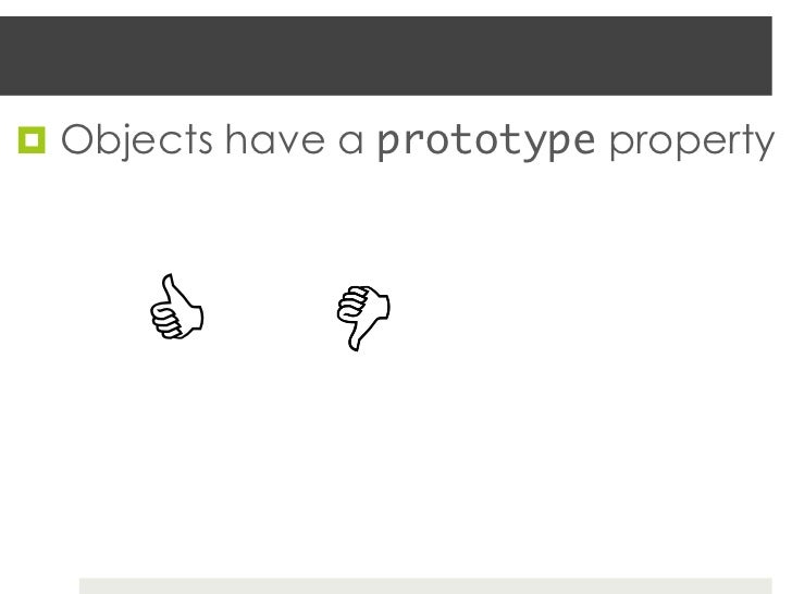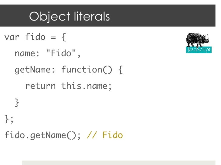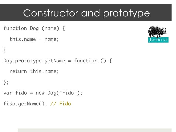 Constructor and prototypefunction Dog (name) { this.name = name; } Dog.prototype.getName = function () { return this.name; }; var fido = new Dog("Fido"); fido.getName(); // Fido