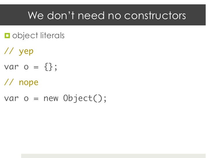 We don’t need no constructors¤ object literals // yep var o = {}; // nope var o = new Object();