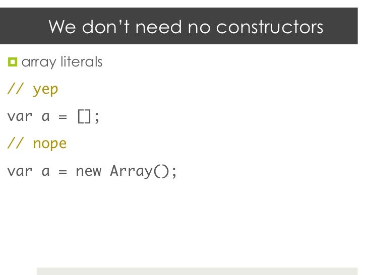 We don’t need no constructors¤ array literals // yep var a = []; // nope var a = new Array();