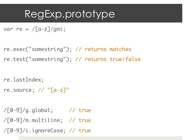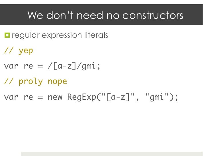 We don’t need no constructors¤ regular expression literals // yep var re = /[a-z]/gmi; // proly nope var re = new RegExp("[a-z]", "gmi");