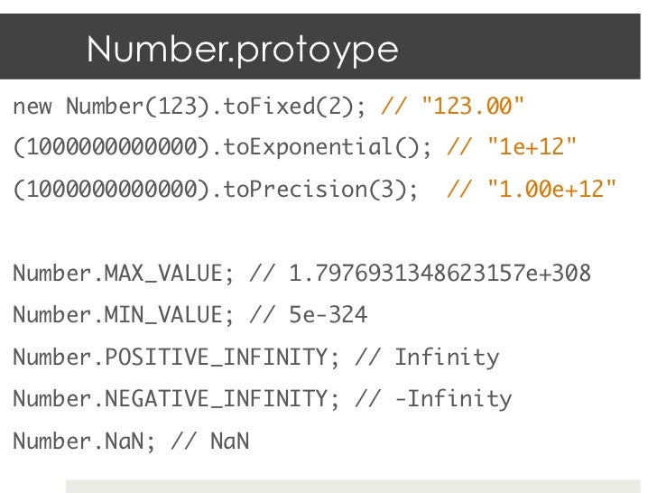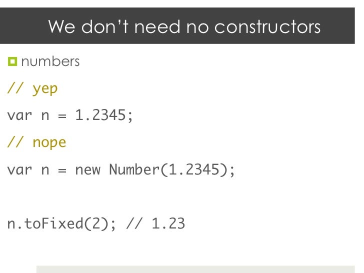 We don’t need no constructors¤ numbers // yep var n = 1.2345; // nope var n = new Number(1.2345); n.toFixed(2); // 1.23