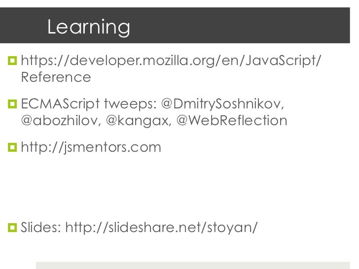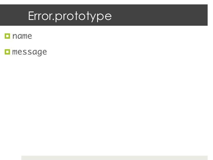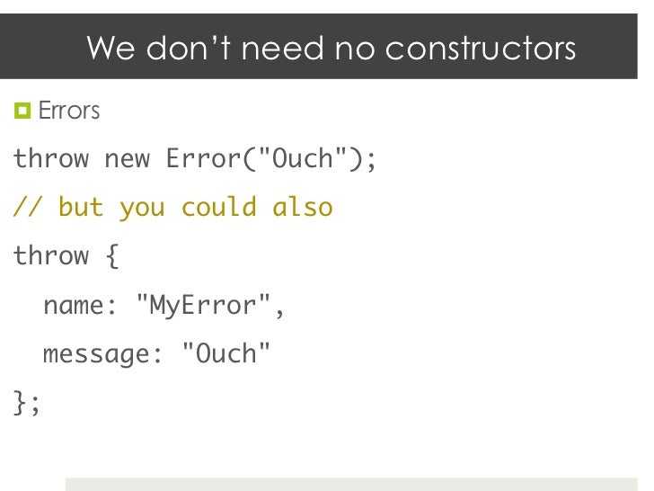 We don’t need no constructors¤ Errors throw new Error("Ouch"); // but you could also throw { name: "MyError", message: "Ouch" };