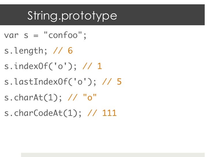 We don’t need no constructors¤ strings // yep var s = "confoo"; // nope var s = new String("confoo"); s.substr(3); // "foo" "confoo".substr(0, 4); // "conf"
