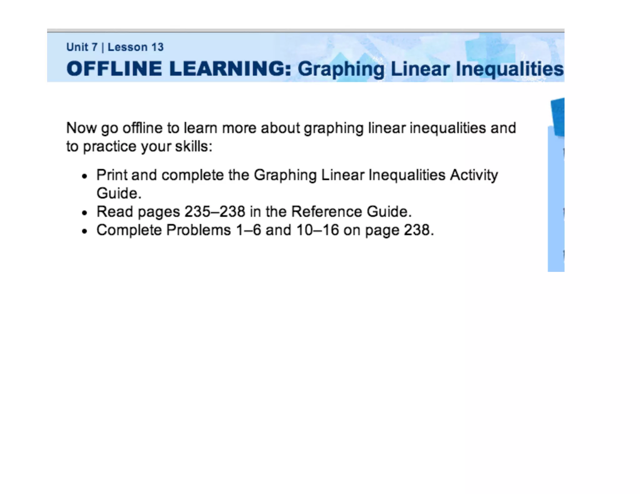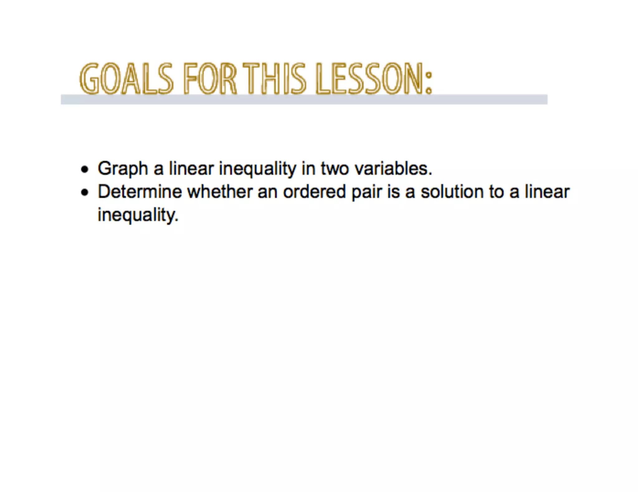 This document provides instructions for graphing linear inequalities on a coordinate plane. It reviews graphing linear equalities and defines the four types of inequalities: less than, greater than, less than or equal to, and greater than or equal to. Examples of individual inequalities are given, such as y > 5 and x ≤ 3. The document explains that the solution to an inequality includes all points on or within the boundary line. It poses questions about graphing an inequality line, including identifying the y-intercept, slope, border, shading, solutions and non-solutions.