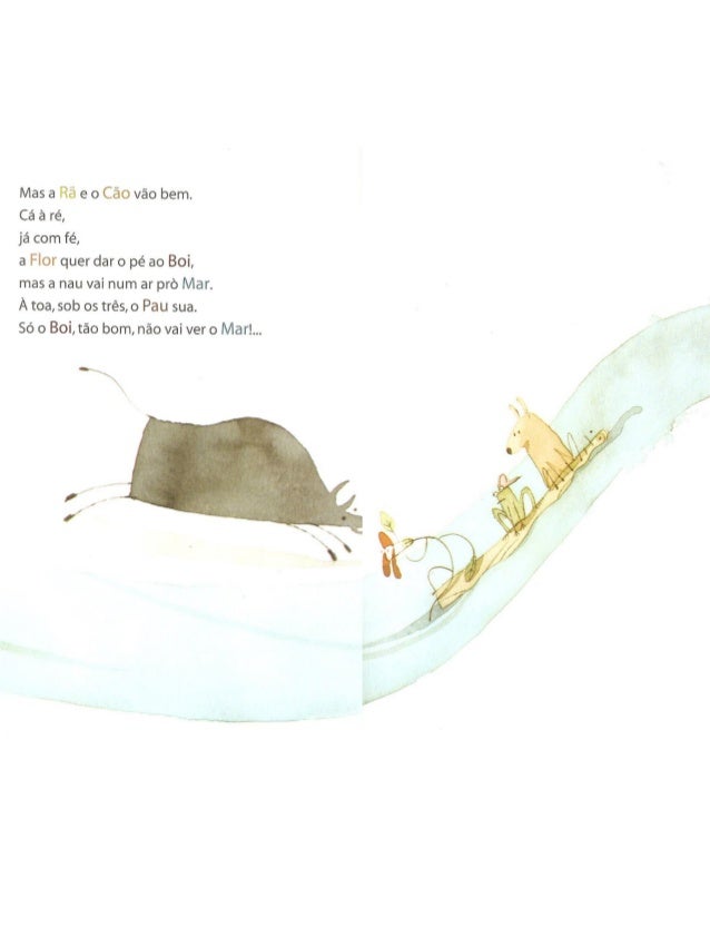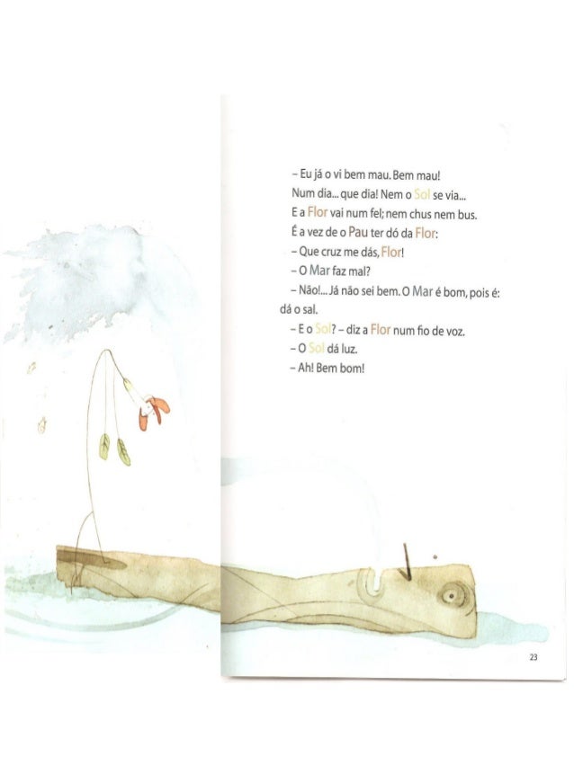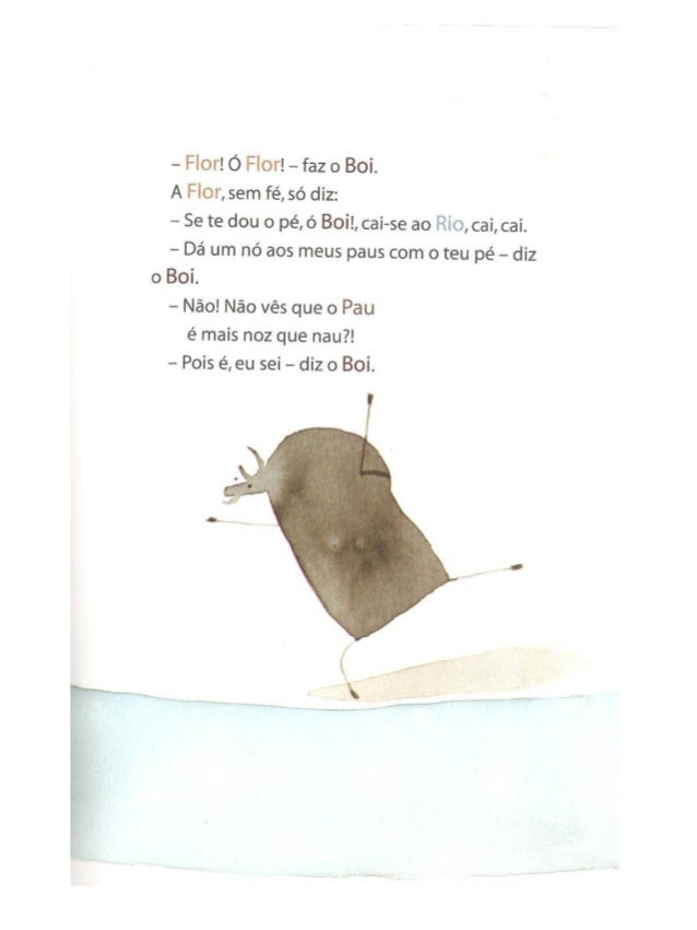 23. 23. - F| or! Ó Flor! -faz o Boi. A Flor, sem fé, só diz: - Se te dou o pé, ó Boi! , cai-se ao Rio, cai, cai. - Dá um nó aos meus paus com o teu pé - diz o Boi. - Não! Não vês que o Pau é mais noz que nau? ! - Pois é, eu sei- diz o Boi.