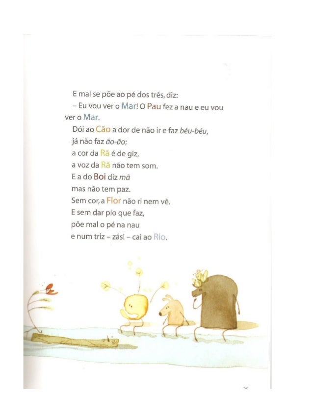 11. 11. Ao pé do Rio e da Fior há um Pau. Um Pau com ar de mau. - Quem és tu? - diz a Flor por ñm. - Eu sou o Pau. A tua dor faz dó. Vem daí, vem! E vaia Flor e diz ao Pau: -Tu és mau! Mas se não tens pés, não vais, não! E tu não tens pés. Ri o Pau da Flor: - Pois sim, s¡m! Mas eu sou o Pau que faz a nau. .. que vai ao Mar. .. / “ J r d' 4x12*