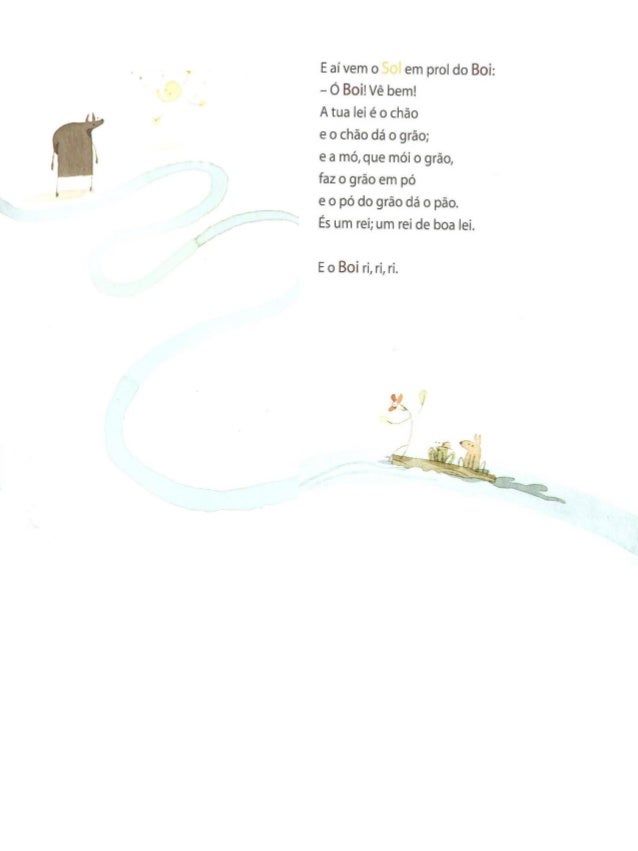 25. 25. E aívem o Sol em prol do Boi: . Í_ - Ó Boi! Vê bem! A tua lei é o chão e o chão dá o grão; e a mó, que mói o grão, faz o grão em pó i eo pó do grão dá o pão. És um rei; um rei de boa lei. E o Boi ri, ri, ri.