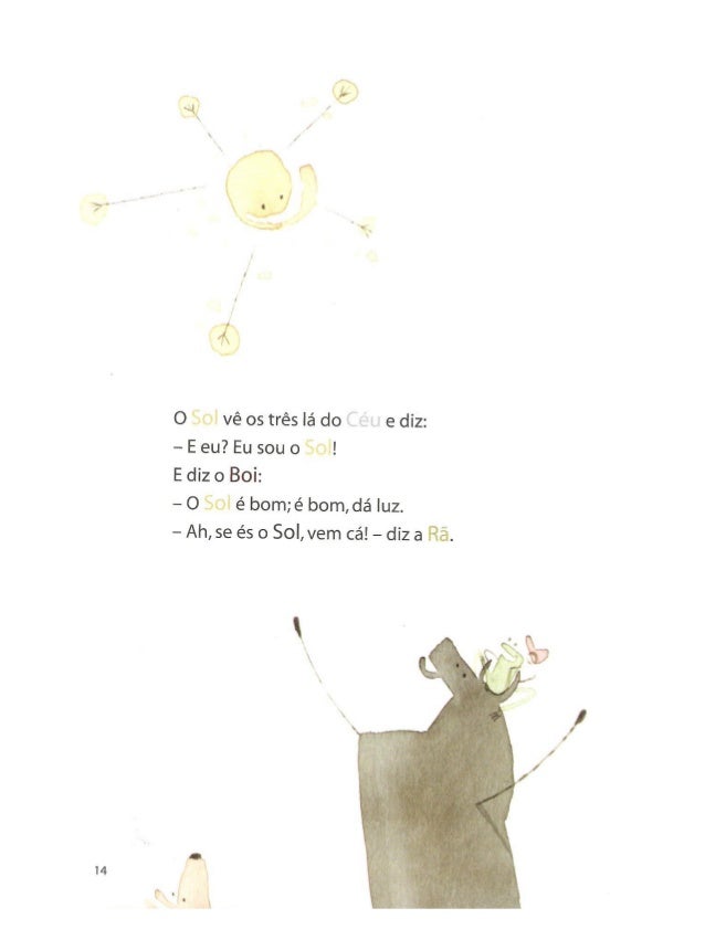 8. 8. n5>x fx ; a / I n x s---' ' ' f *E 7°" ç Tc-. d " “g O Sol vê os três lá do e diz: - E eu? Eu sou o Sol! E diz o B0¡: - O So¡ é bom; é bom, dá luz. - Ah, se és o Sol, vem cá! - diz a Rã. 14