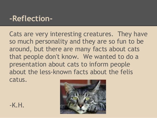 10. 10. -Reflection-Cats are very interesting creatures. They haveso much personality and they are so fun to bearound, but there are many facts about catsthat people dont know. We wanted to do apresentation about cats to inform peopleabout the less-known facts about the feliscatus.-K.H.