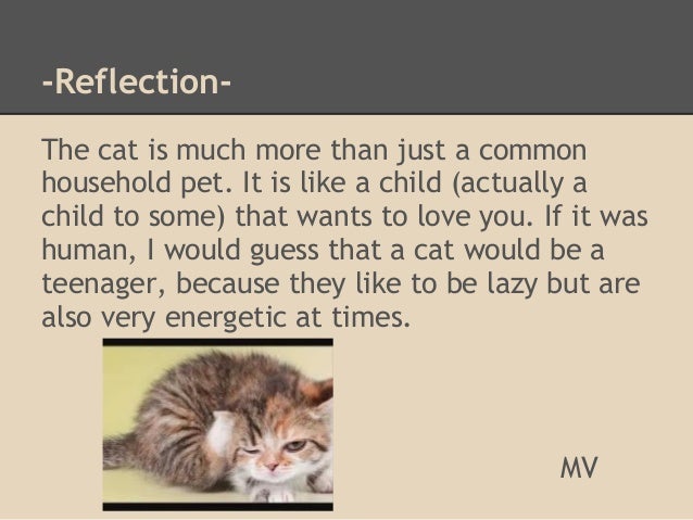11. 11. -Reflection-The cat is much more than just a commonhousehold pet. It is like a child (actually achild to some) that wants to love you. If it washuman, I would guess that a cat would be ateenager, because they like to be lazy but arealso very energetic at times. MV