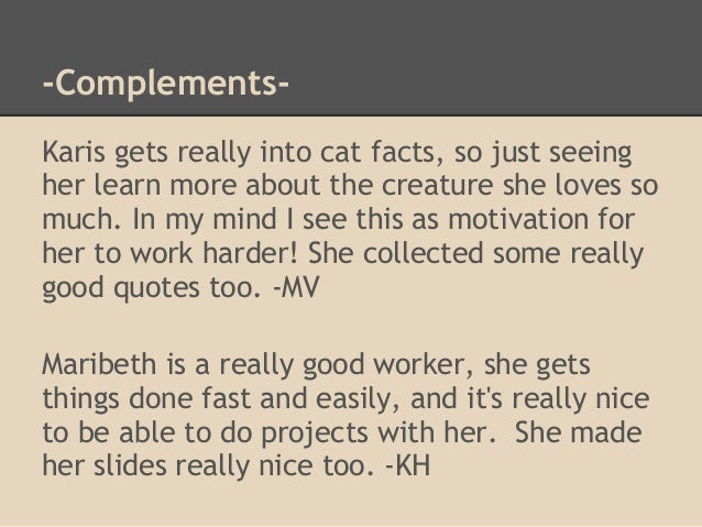 12. 12. -Complements-Karis gets really into cat facts, so just seeingher learn more about the creature she loves somuch. In my mind I see this as motivation forher to work harder! She collected some reallygood quotes too. -MVMaribeth is a really good worker, she getsthings done fast and easily, and its really niceto be able to do projects with her. She madeher slides really nice too. -KH