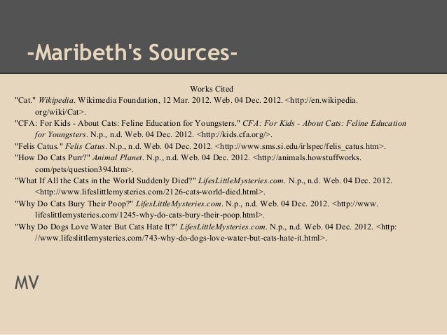 13. 13. -Maribeths Sources- Works Cited"Cat." Wikipedia. Wikimedia Foundation, 12 Mar. 2012. Web. 04 Dec. 2012. <http://en.wikipedia. org/wiki/Cat>."CFA: For Kids - About Cats: Feline Education for Youngsters." CFA: For Kids - About Cats: Feline Education for Youngsters. N.p., n.d. Web. 04 Dec. 2012. <http://kids.cfa.org/>."Felis Catus." Felis Catus. N.p., n.d. Web. 04 Dec. 2012. <http://www.sms.si.edu/irlspec/felis_catus.htm>."How Do Cats Purr?" Animal Planet. N.p., n.d. Web. 04 Dec. 2012. <http://animals.howstuffworks. com/pets/question394.htm>."What If All the Cats in the World Suddenly Died?" LifesLittleMysteries.com. N.p., n.d. Web. 04 Dec. 2012. <http://www.lifeslittlemysteries.com/2126-cats-world-died.html>."Why Do Cats Bury Their Poop?" LifesLittleMysteries.com. N.p., n.d. Web. 04 Dec. 2012. <http://www. lifeslittlemysteries.com/1245-why-do-cats-bury-their-poop.html>."Why Do Dogs Love Water But Cats Hate It?" LifesLittleMysteries.com. N.p., n.d. Web. 04 Dec. 2012. <http: //www.lifeslittlemysteries.com/743-why-do-dogs-love-water-but-cats-hate-it.html>.MV