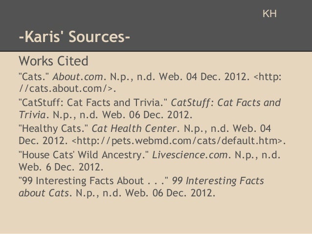 14. 14. KH-Karis Sources-Works Cited"Cats." About.com. N.p., n.d. Web. 04 Dec. 2012. <http://cats.about.com/>."CatStuff: Cat Facts and Trivia." CatStuff: Cat Facts andTrivia. N.p., n.d. Web. 06 Dec. 2012."Healthy Cats." Cat Health Center. N.p., n.d. Web. 04Dec. 2012. <http://pets.webmd.com/cats/default.htm>."House Cats Wild Ancestry." Livescience.com. N.p., n.d.Web. 6 Dec. 2012."99 Interesting Facts About . . ." 99 Interesting Factsabout Cats. N.p., n.d. Web. 06 Dec. 2012.