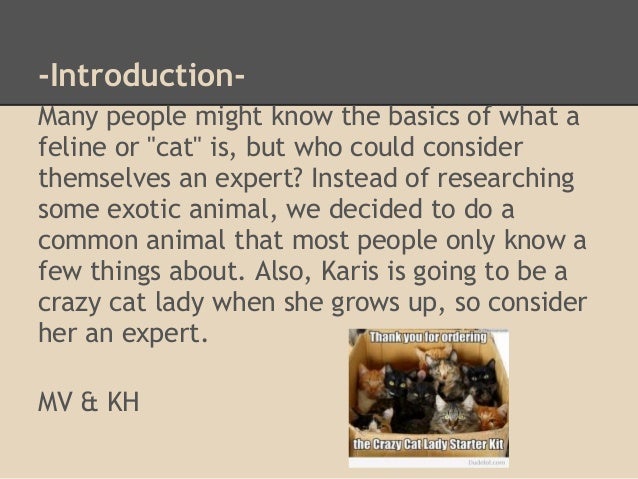 2. 2. -Introduction-Many people might know the basics of what afeline or "cat" is, but who could considerthemselves an expert? Instead of researchingsome exotic animal, we decided to do acommon animal that most people only know afew things about. Also, Karis is going to be acrazy cat lady when she grows up, so considerher an expert.MV & KH