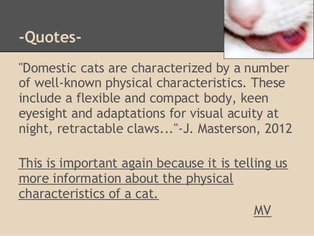 3. 3. -Quotes-"Domestic cats are characterized by a numberof well-known physical characteristics. Theseinclude a flexible and compact body, keeneyesight and adaptations for visual acuity atnight, retractable claws..."-J. Masterson, 2012This is important again because it is telling usmore information about the physicalcharacteristics of a cat. MV