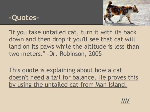 4. 4. -Quotes-"If you take untailed cat, turn it with its backdown and then drop it youll see that cat willland on its paws while the altitude is less thantwo meters." -Dr. Robinson, 2005This quote is explaining about how a catdoesnt need a tail for balance. He proves thisby using the untailed cat from Man Island. MV