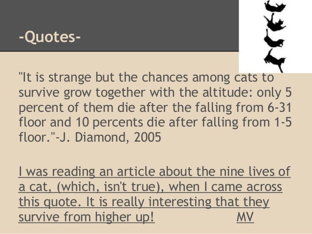 5. 5. -Quotes-"It is strange but the chances among cats tosurvive grow together with the altitude: only 5percent of them die after the falling from 6-31floor and 10 percents die after falling from 1-5floor."-J. Diamond, 2005I was reading an article about the nine lives ofa cat, (which, isnt true), when I came acrossthis quote. It is really interesting that theysurvive from higher up! MV